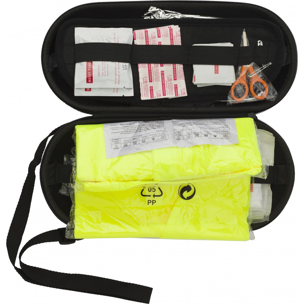 Autós elsősegélykészlet EVA tokban. Tartalma: 15 db ragtapasz, 10 db alkoholos lap, 1 db film kötszer, 2 db biztosítótű, olló, tisztítólapok, biztonsági mellény, takaró, dinamós lámpa. Emblémázás: Szitanyomás, Tamponnyomás