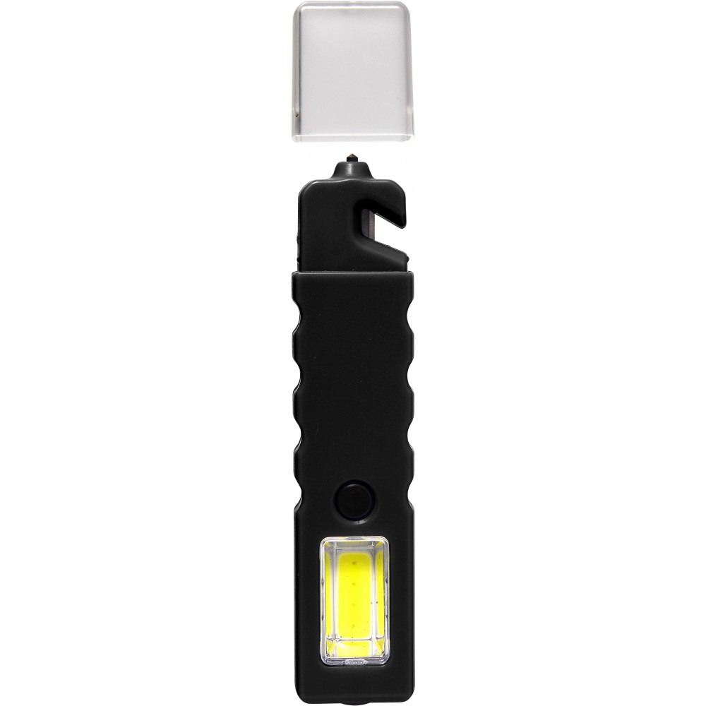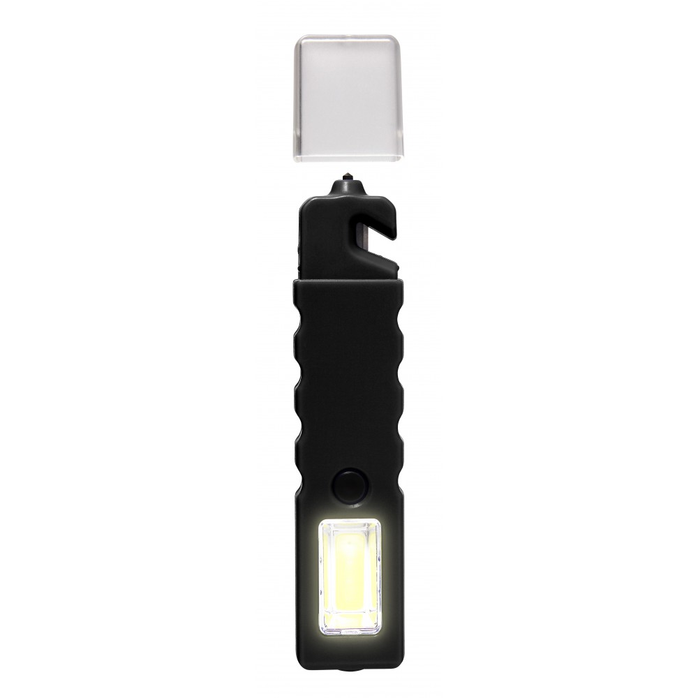 Többfunkciós autósszerszám mágnessel. COB-lámpa villogó móddal, valamint vészhelyzeti ablaktörő, biztonságiöv-vágó védőkupakkal. Az elemet tartalmazza. Emblémázás: Tamponnyomás, UV nyomtatás