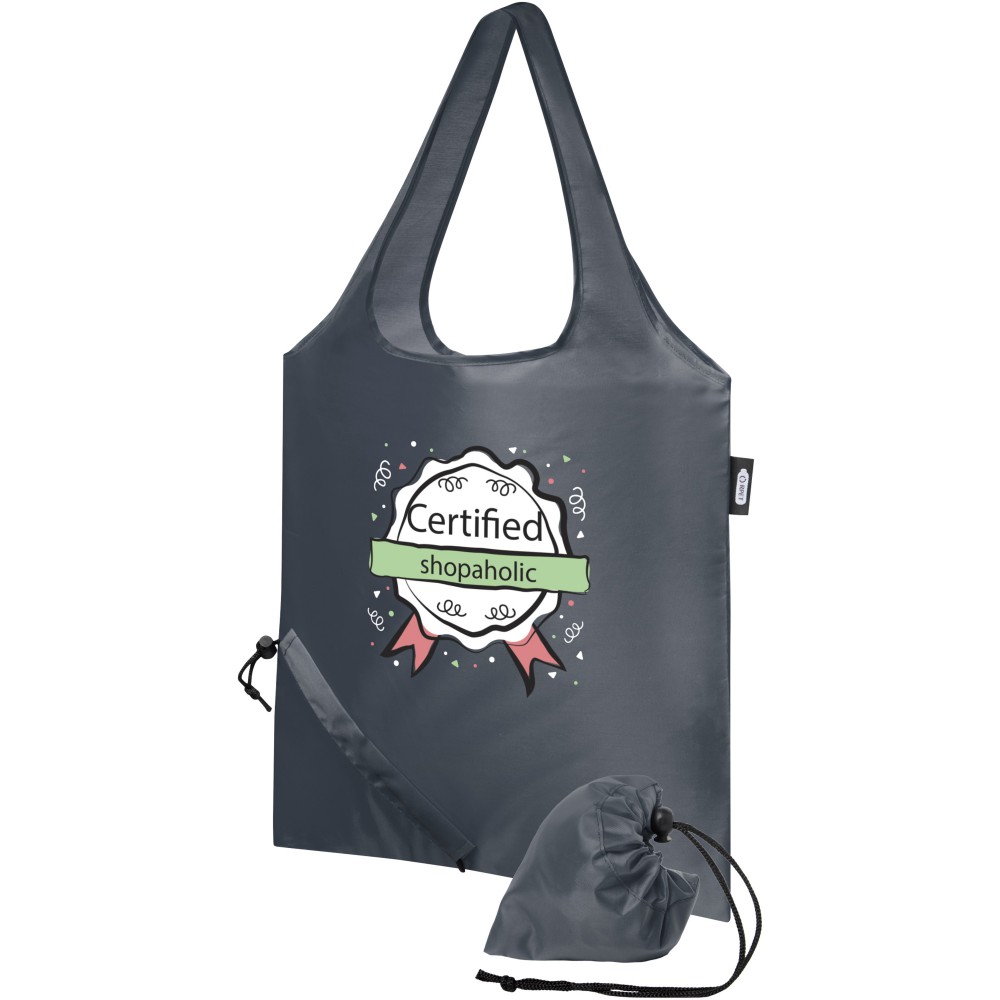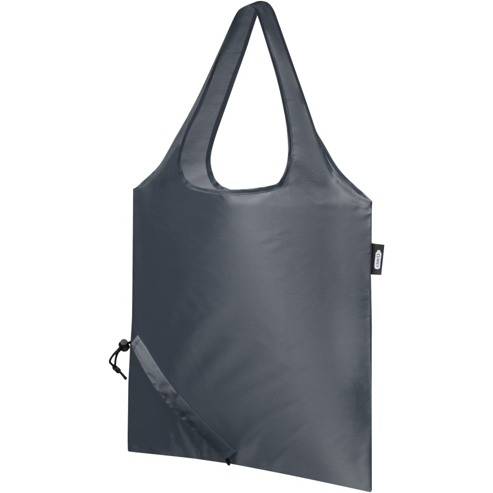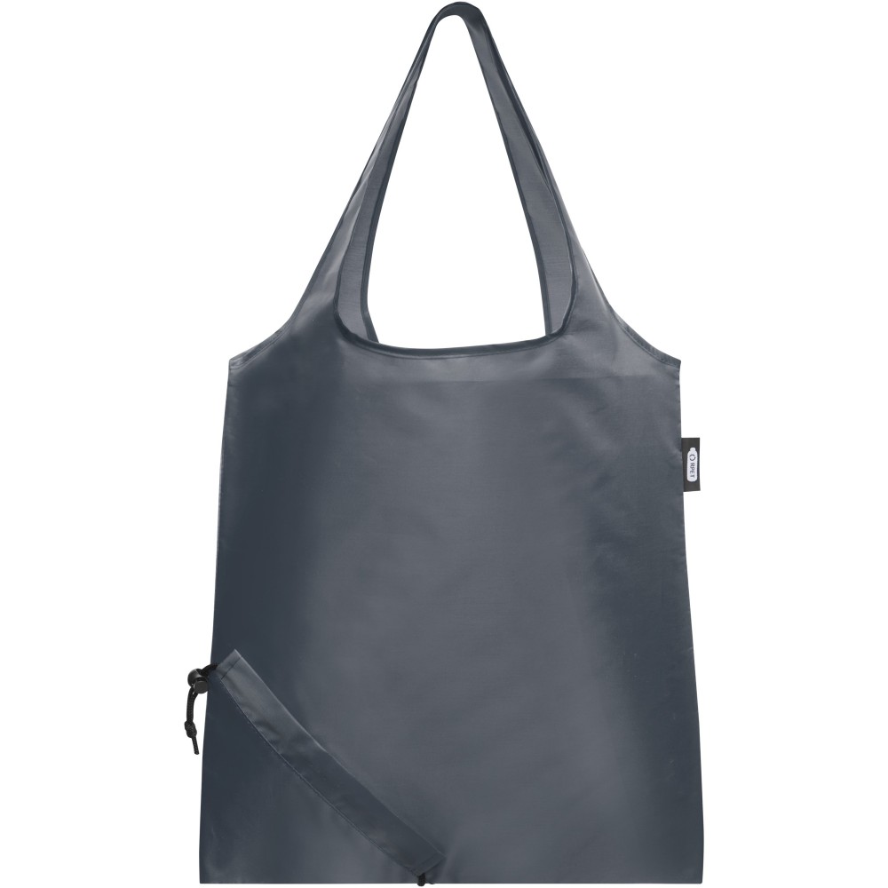 Bevásárlótáska egy nyitott fő rekesszel. Összehajtva zsinórral rögzíthető. A fülek magassága 26 cm. RPET. Emblémázás: Szitanyomás