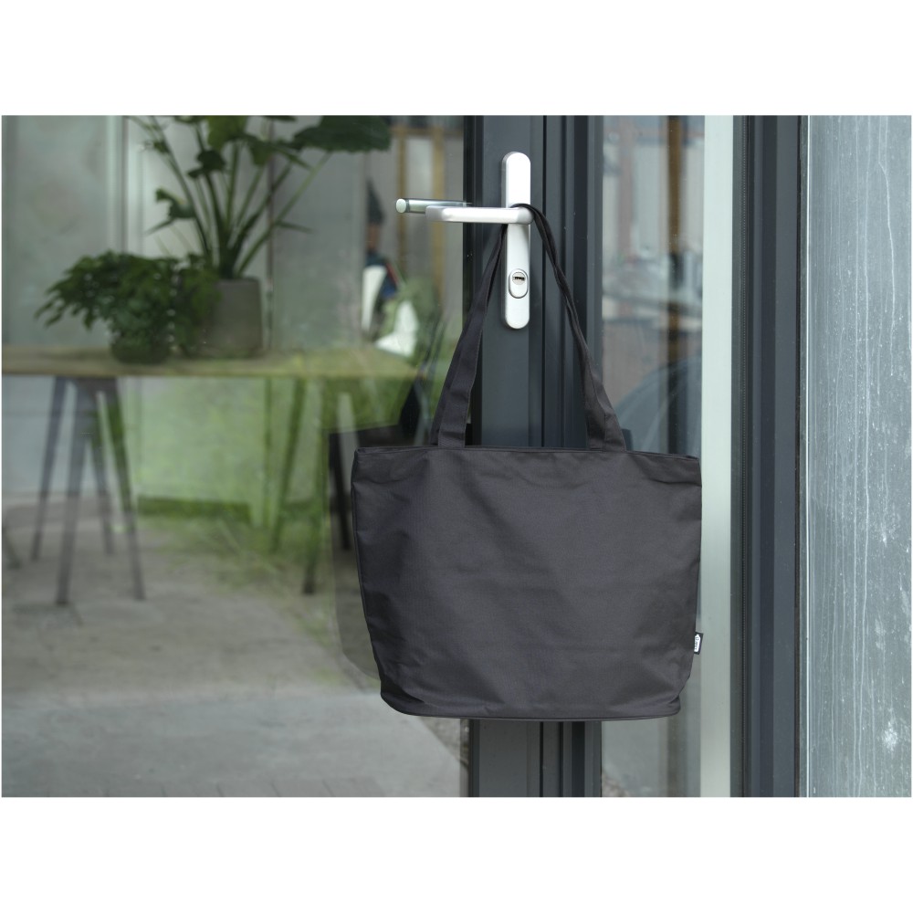 A vízlepergető 600D rPET anyagból készült Panama GRS újrahasznosított cipzáras táska tökéletes és fenntartható választás, ha rendezvényre, strandra vagy bevásárlásra készülsz. Egy cipzáras főrekesszel és egy cipzáras belső zsebbel rendelkezik, amely elég nagy a telefonod vagy más értékes holmi tárolására. Fülei 34 cm hosszúak, ezért a táska könnyen hordozható vállon. Teherbírás: 10 kg. PVC-mentes. Emblémázás: Szitanyomás
