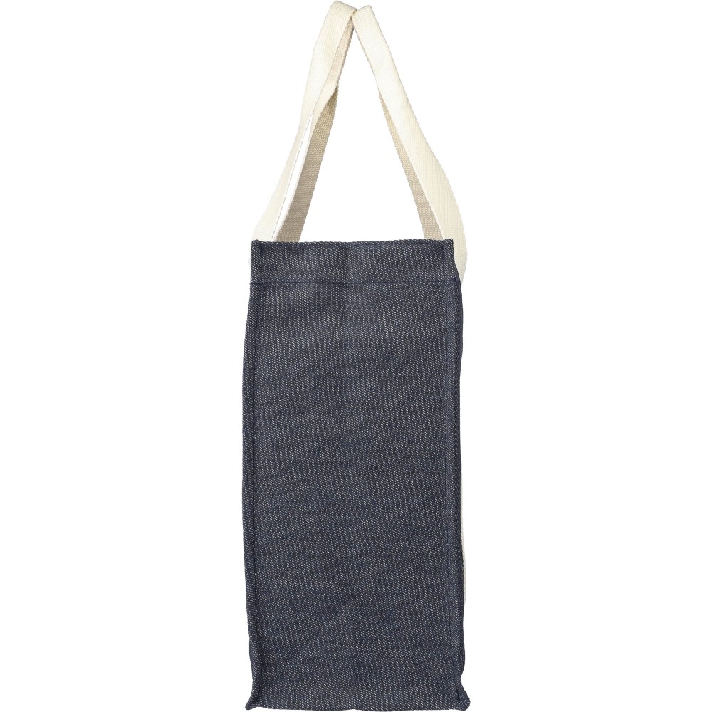 Bevásárlótáska 15 cm-es talpszélességgel és hosszú vászon fogantyúkkal. A farmer anyag 65% poliészterből és 35% pamutból készült. Egy nyomógombbal zárható. A farmer színtartóssága 2-3 szintig terjed. Anyaga: 280 g/m2. Emblémázás: Szitanyomás