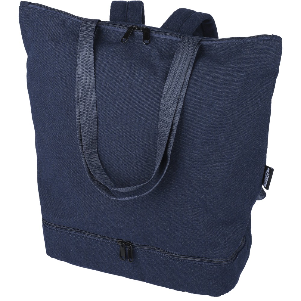 Bevásárlótáska és hátizsák 330 g/m2 újahasznosított policotton anyagból, 210D poliészter béléssel. Egy nagy cipzáras rekesszel a tetején, cipzáras rekesszel az alján, 15"-es laptoptartó résszel, két belső rekesszel és egy külső cipzáras résszel. Hordozófüllel és párnázott, állítható vállpánttal. Űrtartalom: 30 liter, teherbíró képesség: 15 kg. Címkét tartalmaz. Emblémázás: Szitanyomás