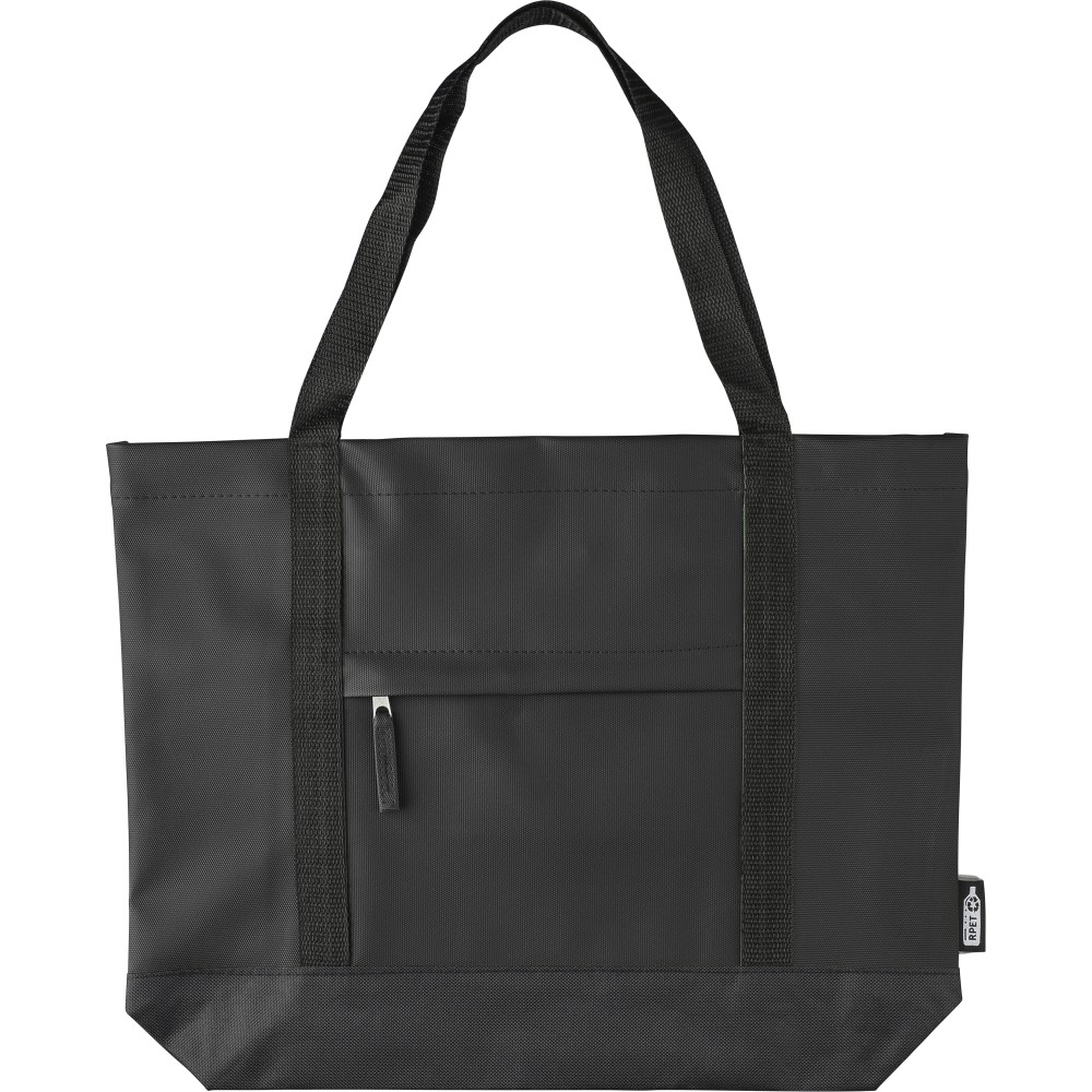 600D rPET poliészter bevásárlótáska. Mindkét oldalon PU bevonat teszi vízlepergetővé. Első cipzáras zsebbel, kicsi, belső cipzáras zsebbel és hosszú hordozófüllel. Kapacitása 10 liter. Oldalán rPET címkével. Emblémázás: Szitanyomás