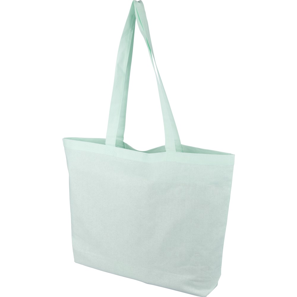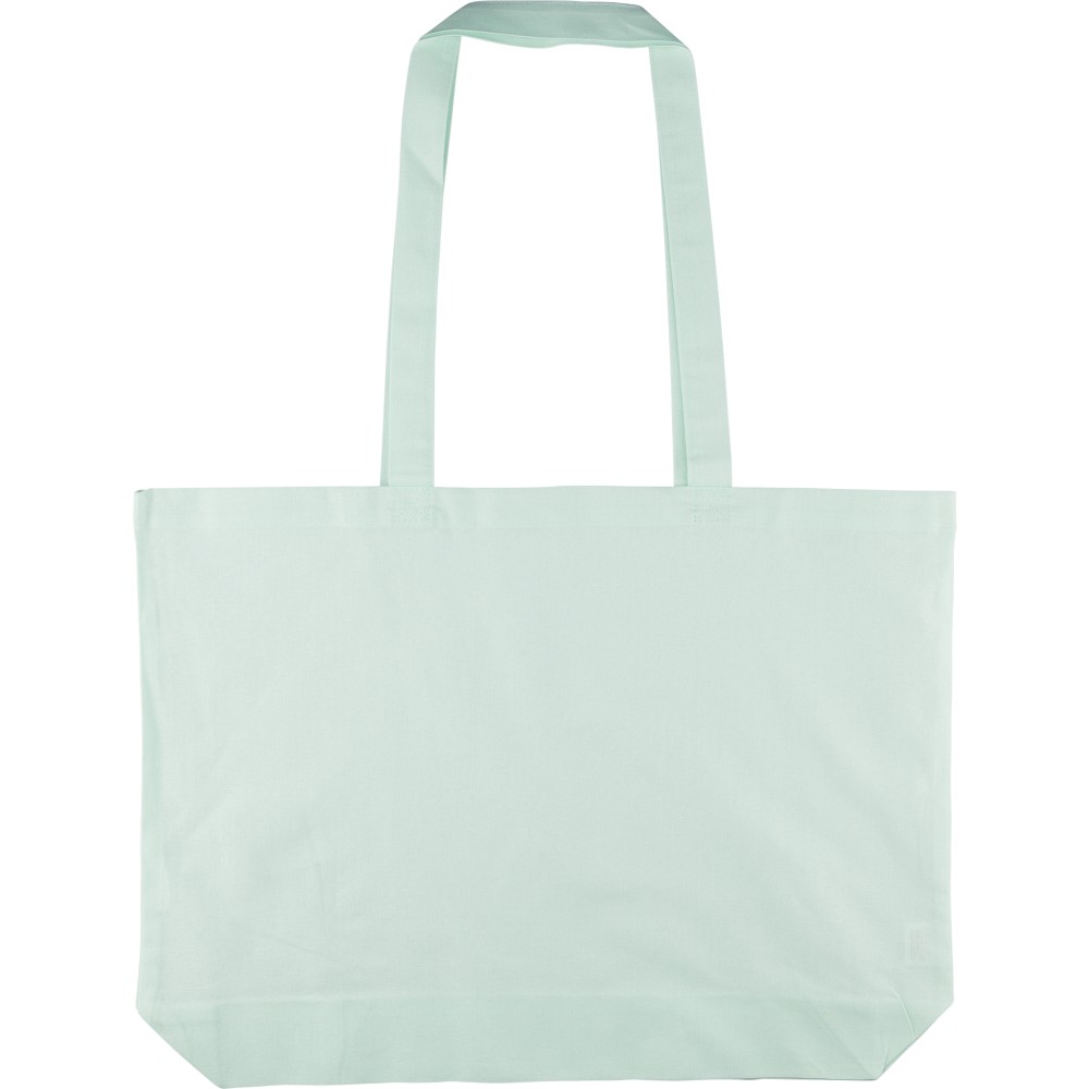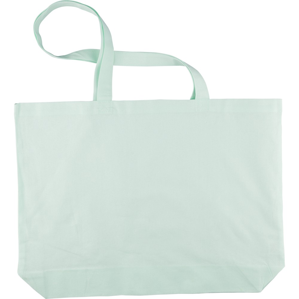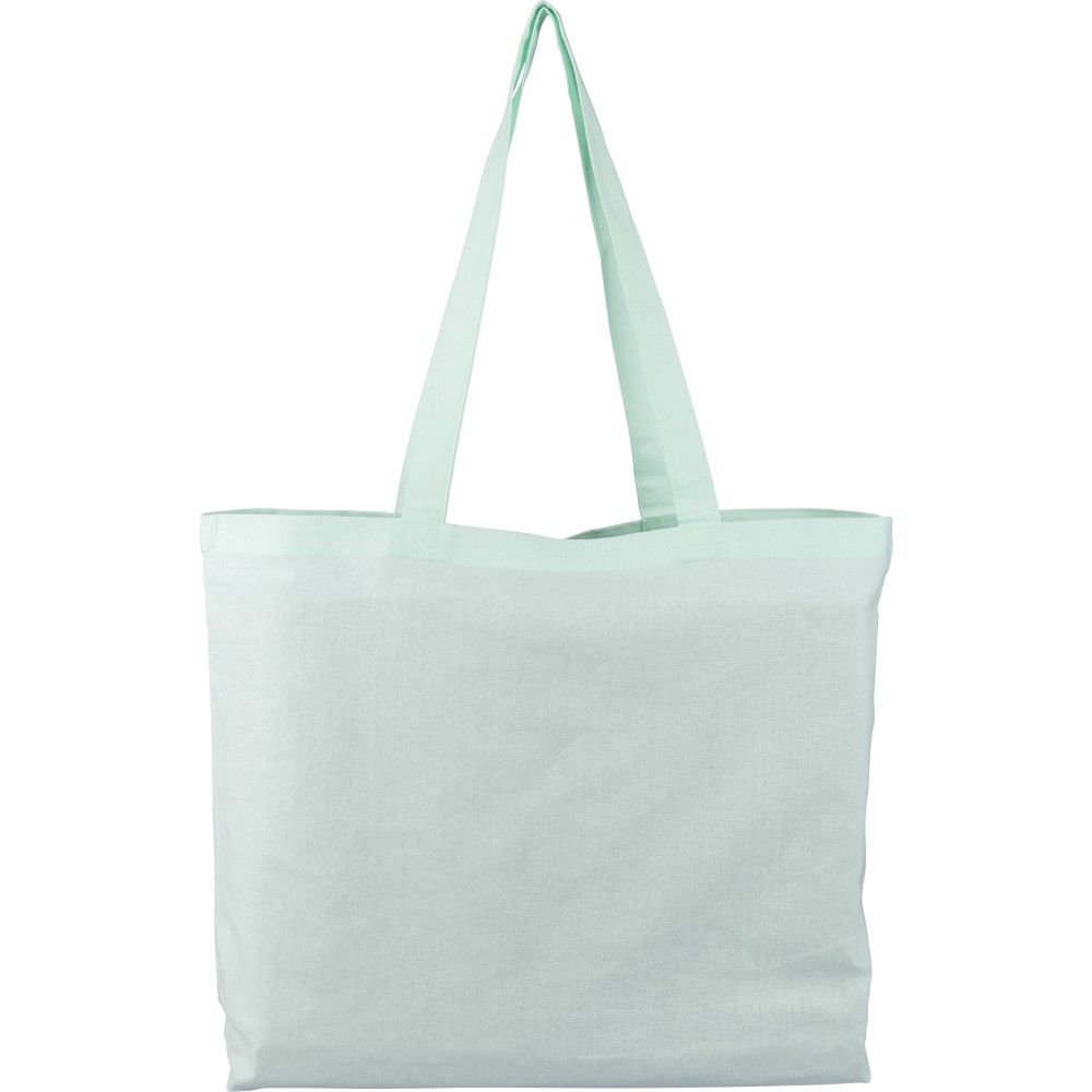 Oeko-Tex minősítésű, 140 g/m2 pamutból készült bevásárlótáska 10 cm-es talppal és 70 cm hosszúságú, 2,5 cm szélességű hosszú fülekkel. Pasztell színekben elérhető: PMS 9562U (zöld), 162U (narancs), 317U (kék) és 522U (lila). Oeko-Tex címkével ellátva. Emblémázás: Szitanyomás