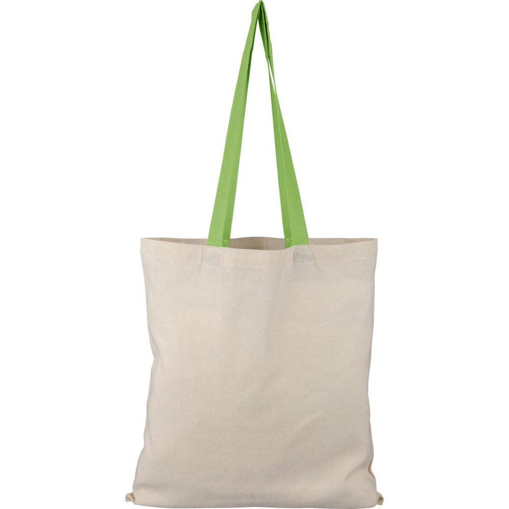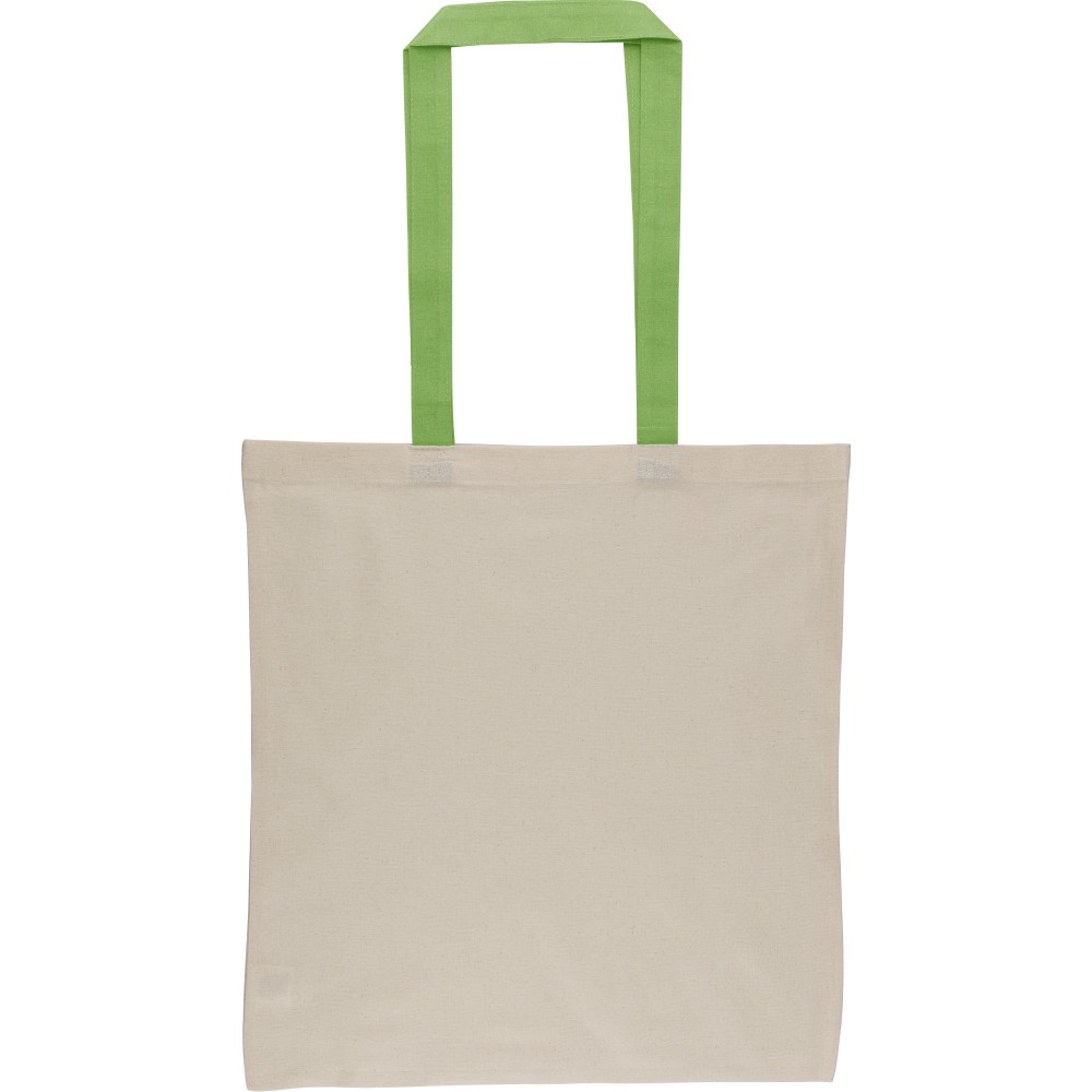 Oeko-Tex minősítésű, 140 g/m2 pamutból készült bevásárlótáska natúr színben, színes fülekkel. Mérete 38 × 42 cm, a fülek hossza 70 cm, szélessége 2,5 cm. Oeko-Tex címkével ellátva. Emblémázás: Szitanyomás
