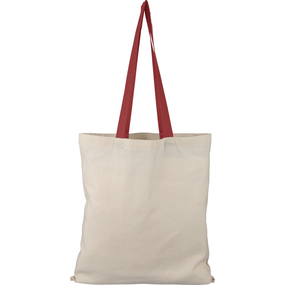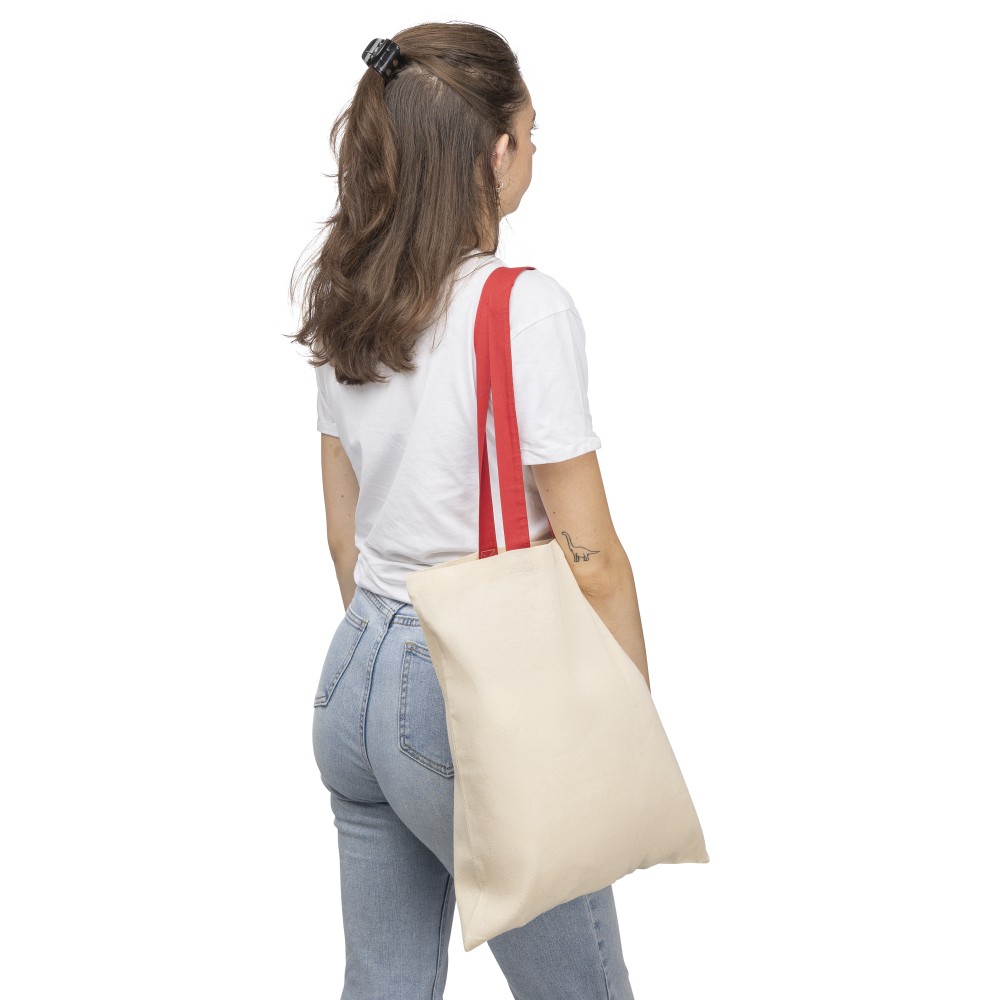 Oeko-Tex minősítésű, 140 g/m2 pamutból készült bevásárlótáska natúr színben, színes fülekkel. Mérete 38 × 42 cm, a fülek hossza 70 cm, szélessége 2,5 cm. Oeko-Tex címkével ellátva. Emblémázás: Szitanyomás