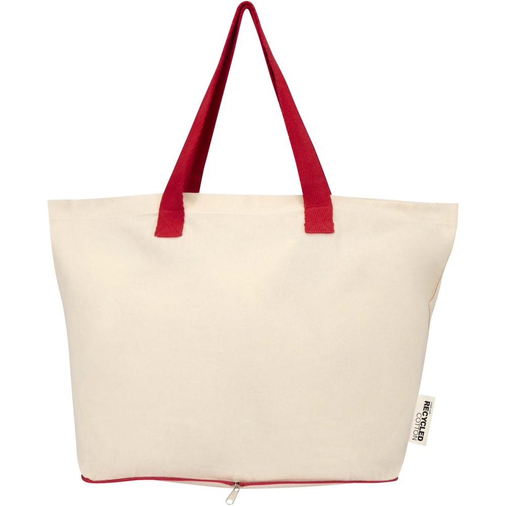 A könnyű és praktikus Sierra összehajtható bevásárlótáska 100% újrahasznosított pamutból készült, GRS tanúsítvánnyal rendelkezik. A 140 g/m2-es anyagsűrűség tökéletes egyensúlyt teremt a rugalmasság és a tartósság között. A táska az alján található cipzáras zsebbe saját magába visszahajtható, így kompakt méretű és könnyen hordozható. Ideális bevásárláshoz, ügyintézéshez vagy utazáshoz. A dupla fülek extra tartást és kényelmet biztosítanak a nehezebb csomagok szállításakor is, teherbírása 10 kg. Űrtartalma: 7 liter. Emblémázás: Szitanyomás