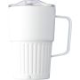 Újrahasznosított rozsdamentes acél útibögre, 450 ml. A belső 304-es, a külső 201-es rozsdamentes acélból készült, bordás markolattal és masszív fogantyúval, műanyag, csúszózáras fedéllel. Gravírozott újrahasznosított logó található a bögrén. Csomagolása barna papírdoboz. Emblémázás: Bögredekor, Gravírozás