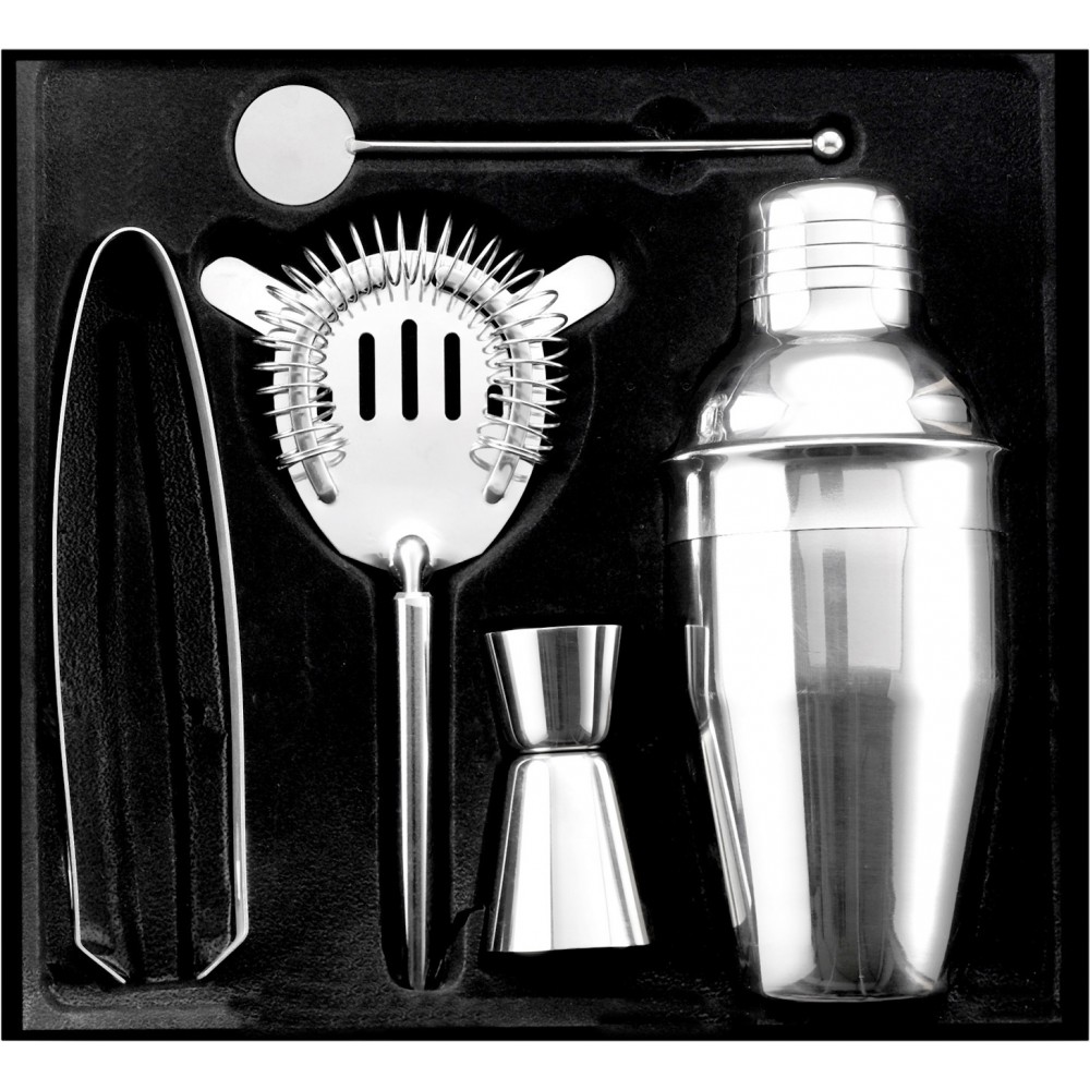 Koktélos készlet díszdobozban. 0,25 literes shaker, jégkockacsipesz, kanál, szűrő és mérőpohár. Emblémázás: Gravírozás