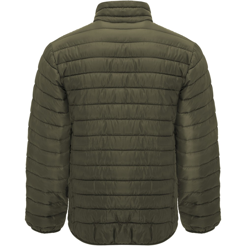 Férfi steppelt, dzseki tollszerű béléssel, tokkal. Fordított cipzárak, hozzáillő színű állvédő és cipzár. Két cipzáras elülső zseb. Színben illeszkedő szegély a galléron, a kézelőn és az alsó szegélyen. Kontrasztos színű belső bélés. Könnyű és összehajtható ruhadarab. Vízálló. Szélálló. 100% poliészter, 290 g/m2. A bélés 100% poliészter, a töltet 100% poliészter. Emblémázás: Hímzés