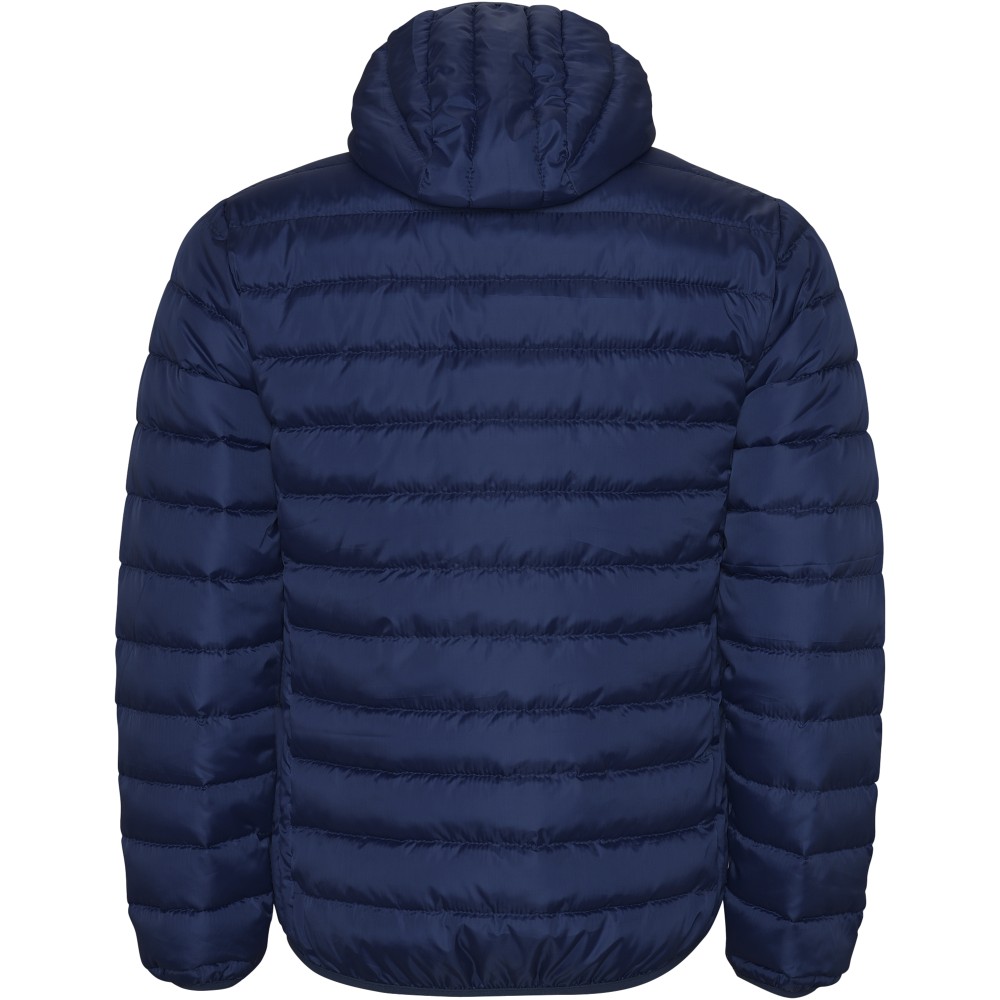 Pehely tapintású férfi steppelt dzseki kapucnival, tasakkal. Fordított cipzárakkal, hozzá illő állvédővel. Két cipzáras elülső zseb. Gumis kézelő, a alj- és a kapucniszegély. Kontrasztos belső bélés. Könnyű és összehajtható ruhadarab. Vízálló. Szélálló modell. 100% poliészter, 290 g/m2. Bélés: 100% poliészter. Töltet: 100% poliészter. Emblémázás: Hímzés