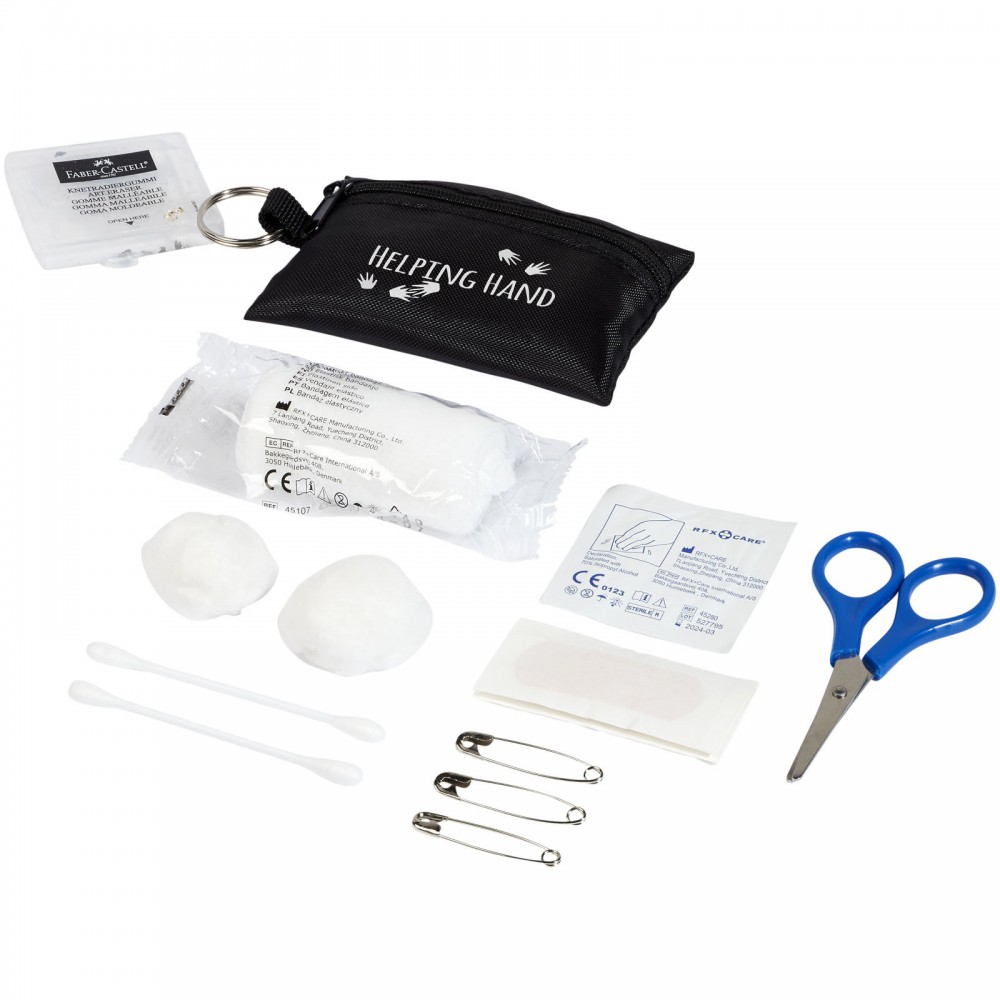 Elsősegélykészlet kulcstartós tokban. Engedély száma: 93/42/EEC. 420D poliészter. Emblémázás: Szitanyomás