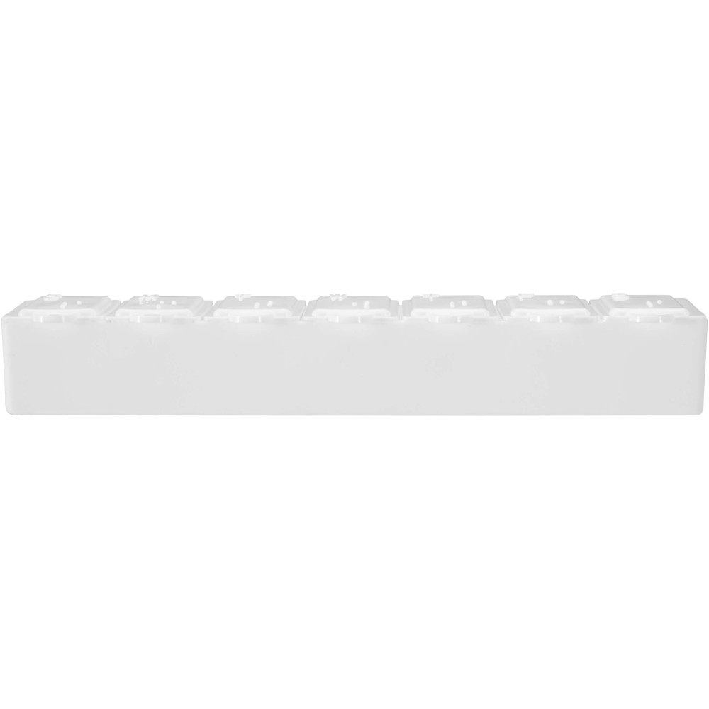 Tartsd rendszerezetten és következetesen a vitaminjaidat ezzel a multivitamin tartó dobozzal, amely segít a napi étrend-kiegészítők nyomon követésében. Gyógyszeresdoboznak, gyógyszertartónak, pirulatartónak is alkalmas. Hét, egyértelműen jelölt rekesszel rendelkezik (hétfőtől vasárnapig), így biztosan nem marad ki egyetlen adag sem. Kompakt és tartós kialakítása miatt utazáshoz és mindennapi használatra egyaránt ideális, megkönnyítve a vitaminok szállítását és tárolását. Emblémázás: Matricázás, Tamponnyomás
