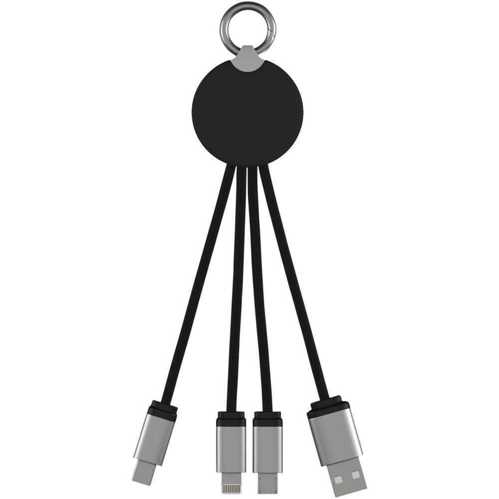 Világító logós töltőkábel gumi és fém bevonattal, három csatlakozóval (Type-C, Android, iPhone). Egyszerre akár három készülék is tölthető. Kábelek hossza (dugókkal együtt): 10 cm. Az újrahasznosított PET műanyag kábel és csomagolás újrahasznosított papírból és újrahasznosított műanyagból készül. Emblémázás: Gravírozás