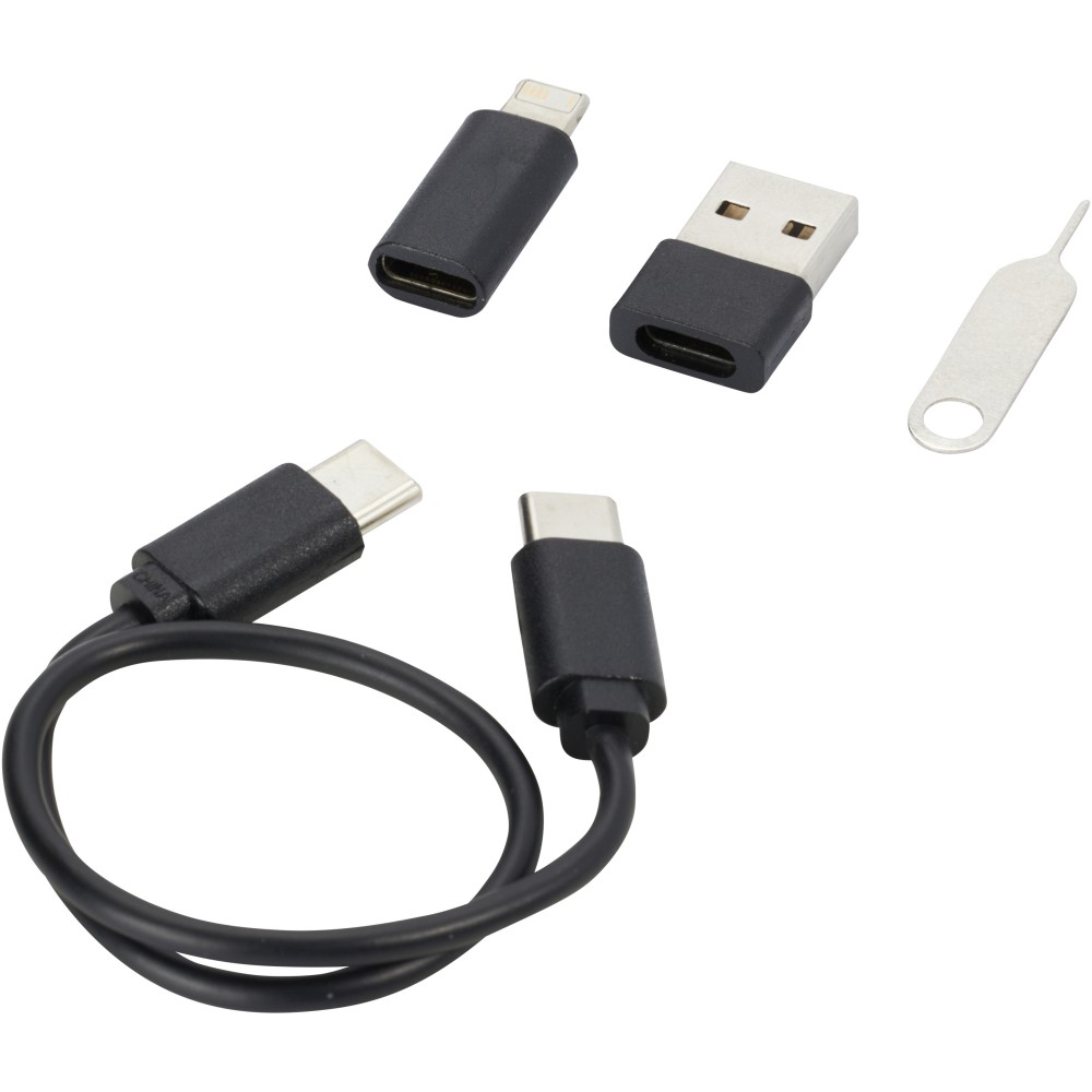 Újrahasznosított műanyagból készült moduláris adat- és töltőkábel, amelyet egy elegáns, telefonállványként is használható tárolódobozba csomagoltunk. A kábel többféle töltési megoldást kínál: C-típusú és USB-A bemenetet, valamint C-típusú/iOS/mikroUSB kimenetet. Mindezen adaptereknek és csatlakozóknak köszönhetően ez a kábel lehetővé teszi a legtöbb okostelefon, fényképezőgép, powerbank, fülhallgató, stb. töltését. A kábel maximális kimeneti teljesítménye 2A. Rendelkezik egy SIM tűvel, amely bármikor jól jön, amikor ki kell venned telefonod SIM-kártyáját. A tárolódobozban egy micro SD memóriakártya, valamint egy nano SIM-kártya tárolására is van hely, így ez a tökéletes utazási kiegészítő. Kábel hossza: 26 cm. 100%-ban újrahasznosított borítékban szállítjuk. Emblémázás: Tamponnyomás