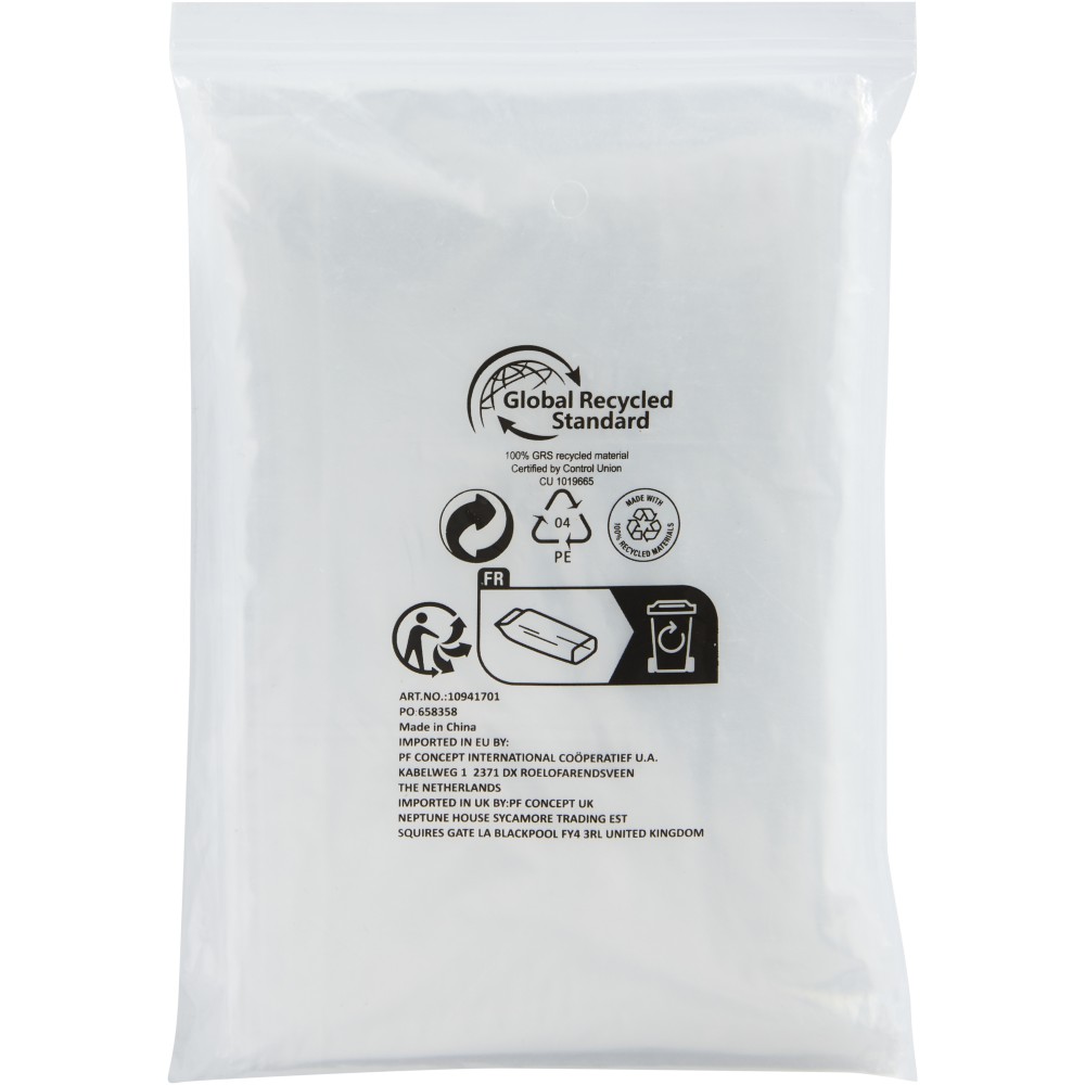 A Maya eldobható esőponcsó 100%-ban újrahasznosított műanyagból készült. Ez az átlátszó, kapucnis poncsó ideális, ha egy szabadtéri fesztiválon vagy bármilyen más szabadtéri rendezvényen elkapja az eső. Nyomtatásra alkalmas tasakkal szállítjuk. Méret: 90 x 120 cm. Emblémázás: Matricázás
