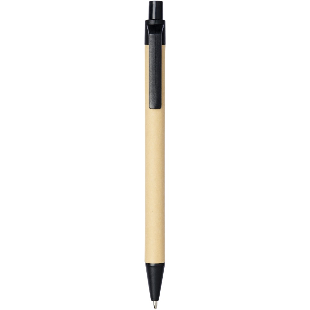 Környezetbarát golyóstoll fekete tollbetéttel, nyomógombos mechanizmussal, biológiailag lebomló papíranyagból készült tolltest és kukorica műanyag kiegészítők. Az újrahasznosított kartondoboz színe nem egységes. Emblémázás: Tamponnyomás, UV nyomtatás