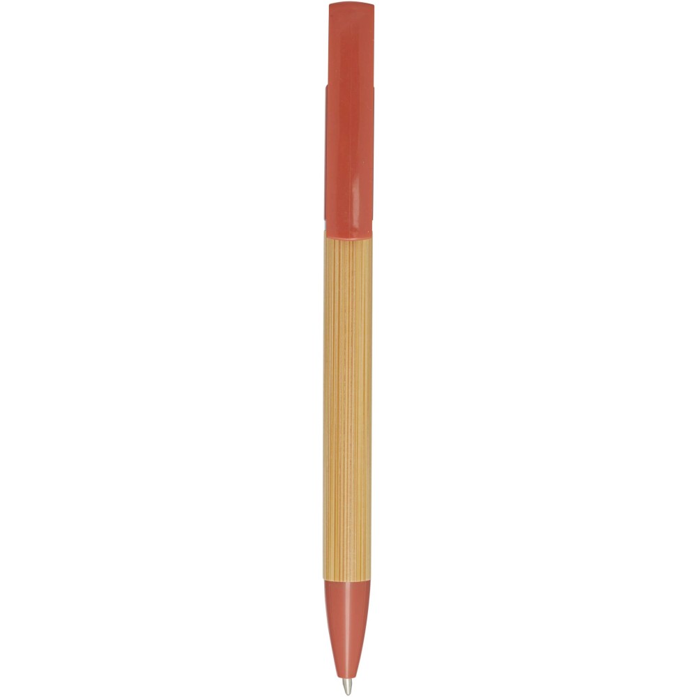Bambusz golyóstoll, amely telefontartóként is funkcionál. A gomb és a középső gyűrű újrahasznosított műanyagból, a hegy rézből, a tollteste pedig felelősen beszerzett bambuszból készült. Fekete tollbetéttel. Írási hossz: 1000 méter. Tollhegy mérete: 1,0 mm. Emblémázás: Tamponnyomás, UV nyomtatás