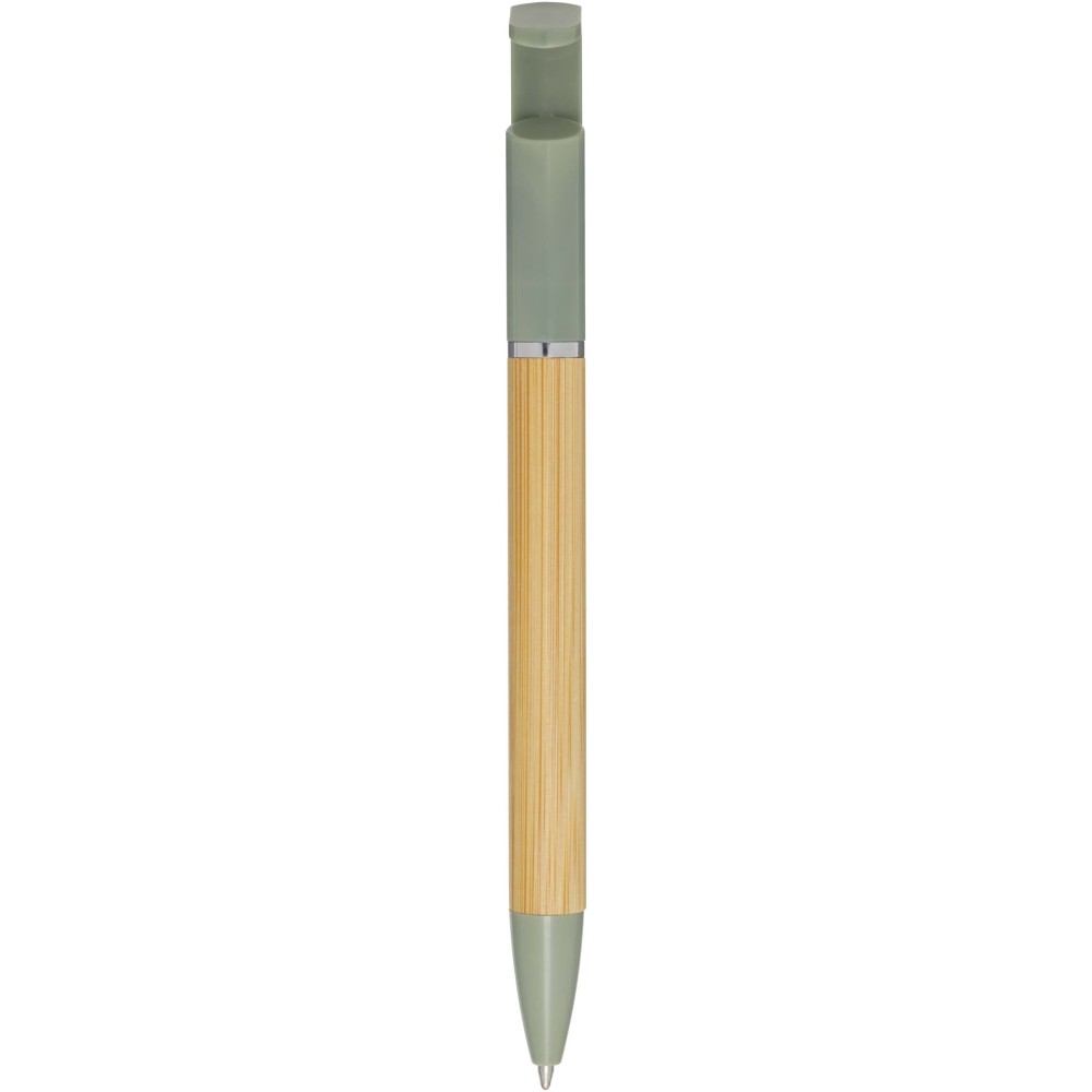 Bambusz golyóstoll, amely telefontartóként is funkcionál. A gomb és a középső gyűrű újrahasznosított műanyagból, a hegy rézből, a tollteste pedig felelősen beszerzett bambuszból készült. Fekete tollbetéttel. Írási hossz: 1000 méter. Tollhegy mérete: 1,0 mm. Emblémázás: Tamponnyomás, UV nyomtatás