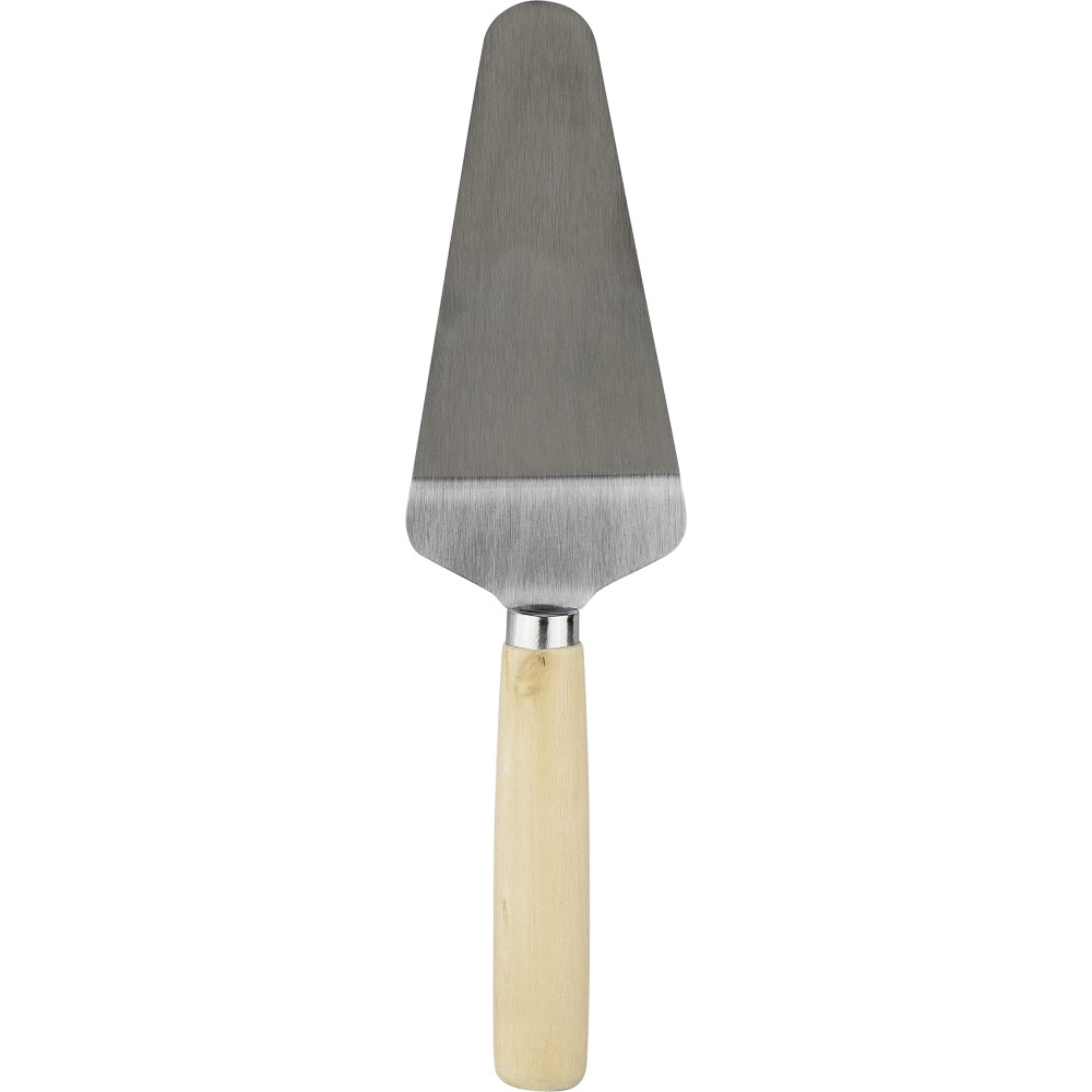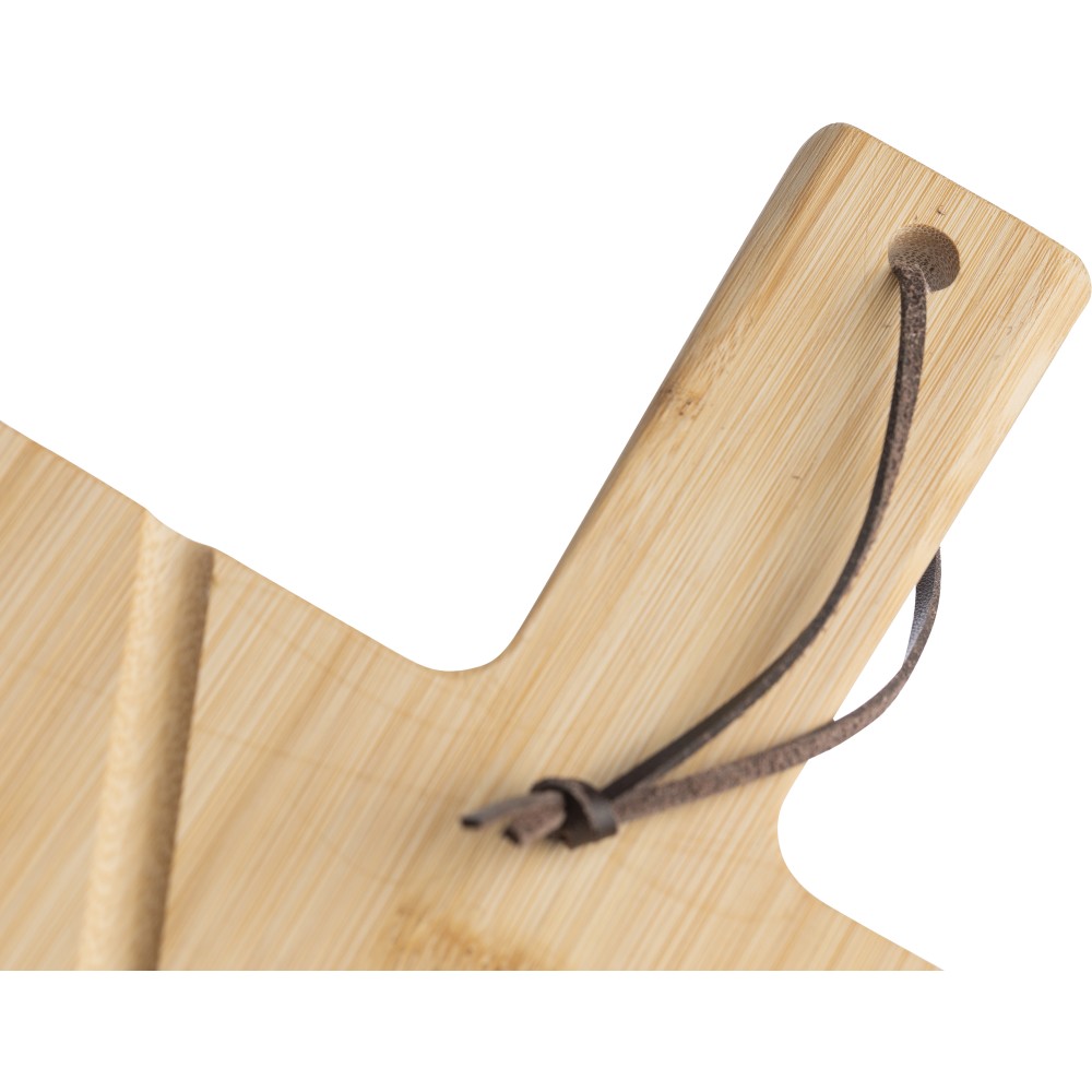 Bambusz pizzavágó deszka nyéllel és a szeletelést könnyítő barázdákkal. A készlet része egy rozsdamentes acélból és bükkfából készült pizzavágó és szervírozólapát is. A deszka nyelén PU akasztószalag található. Csomagolása barna papírdoboz. Emblémázás: Gravírozás