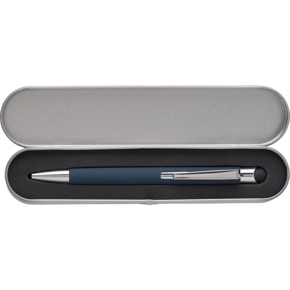 Golyóstoll gumis bevonattal, érintővel, fekete tollbetéttel. Csomagolása fém tolldoboz. Alumínium. Emblémázás: Gravírozás, UV nyomtatás