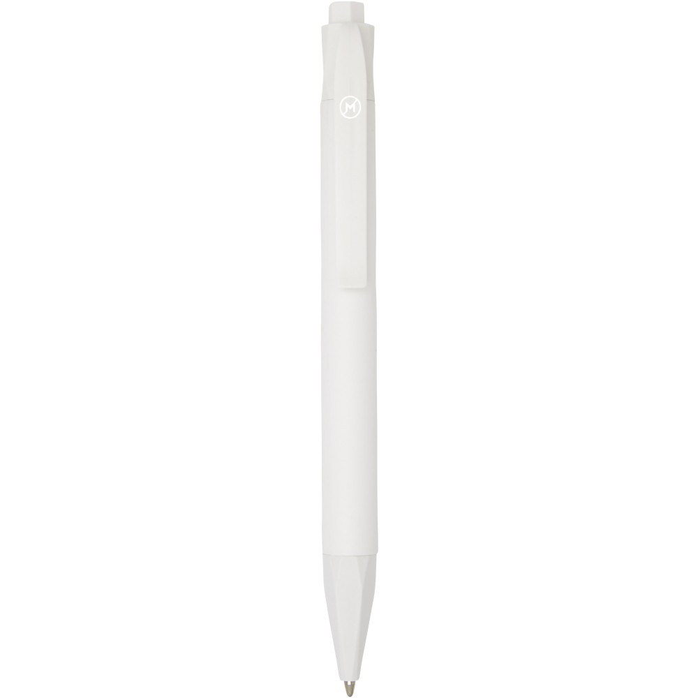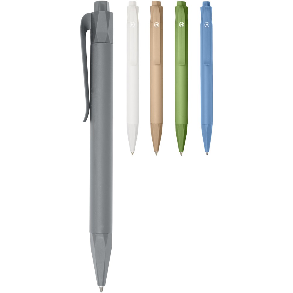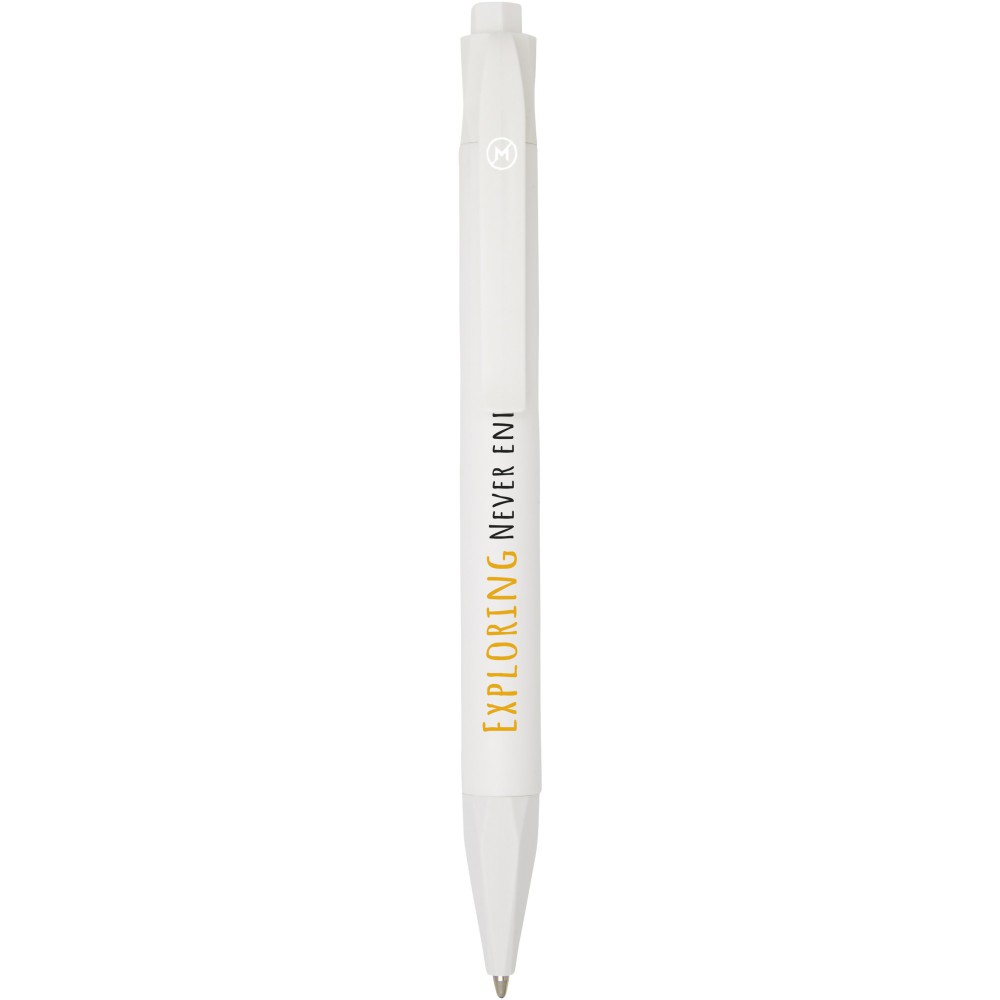 Nyomógombos golyóstoll cserélhető kék tollbetéttel. 100% PLA (kukoricából készült műanyag), amely csökkenti a felhasznált, hagyományos műanyag mennyiségét. A tollbetét íráshossza 2000 méter. Csomagolás karton tok. PLA műanyag. Emblémázás: Tamponnyomás