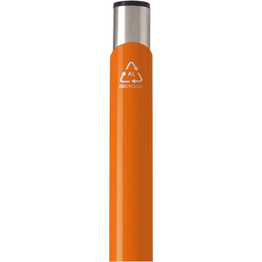 Újrahasznosított alumíniumból készült golyóstoll lakkozott, fényes felülettel és feltűnő króm részletekkel. Az újrahasznosított alumínium kevesebb energiát igényel, mint az alumínium nyersanyagokból történő előállítása, ami fenntarthatóbbá teszi a gyártást. Csökkenti a szemétlerakókba kerülő hulladék mennyiségét és segít a természeti erőforrások megőrzésében, az üvegházhatást okozó kibocsátás csökkentését célozva. Fekete tollbetéttel. Íráskapacitás: 600 méter. Újrahasznosított alumínium, ABS műanyag, vas. Emblémázás: Gravírozás
