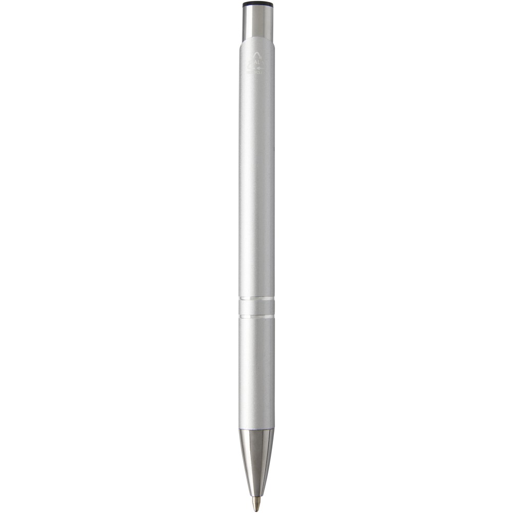 Újrahasznosított alumíniumból készült golyóstoll lakkozott, fényes felülettel és feltűnő króm részletekkel. Az újrahasznosított alumínium kevesebb energiát igényel, mint az alumínium nyersanyagokból történő előállítása, ami fenntarthatóbbá teszi a gyártást. Csökkenti a szemétlerakókba kerülő hulladék mennyiségét és segít a természeti erőforrások megőrzésében, az üvegházhatást okozó kibocsátás csökkentését célozva. Fekete tollbetéttel. Íráskapacitás: 600 méter. Újrahasznosított alumínium, ABS műanyag, vas. Emblémázás: Gravírozás