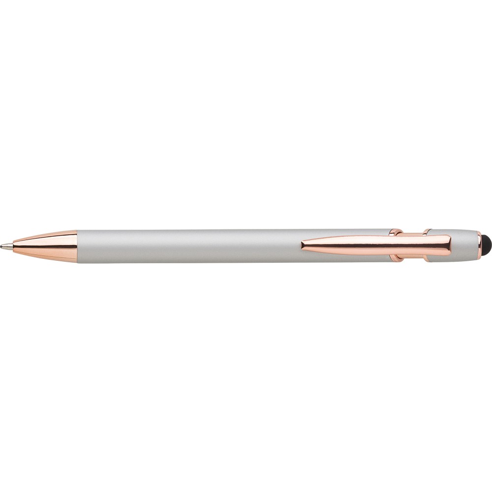 Alumínium golyóstoll rózsaarany részletekkel és érintővel, kék tollbetéttel. Emblémázás: Gravírozás, UV nyomtatás