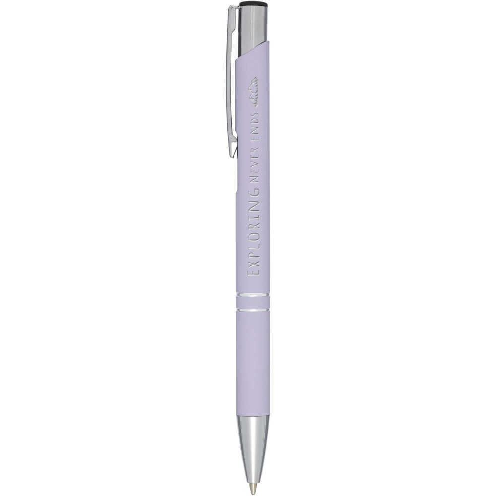 Nyomógombos golyóstoll puha tapintású bevonattal. Lézergravírozáskor megjelenik a toll fényes króm, felület alatti rétege. Fekete tollbetéttel. Emblémázás: Gravírozás