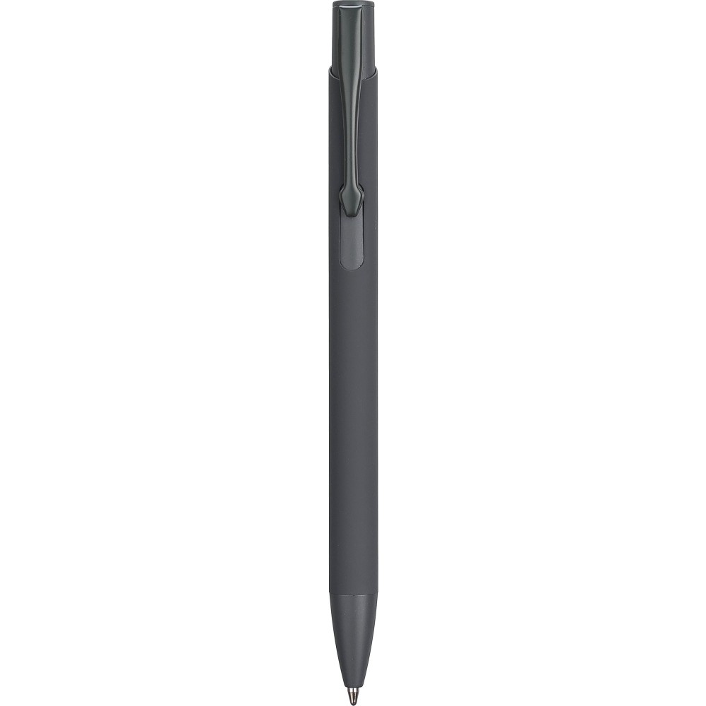 Újrahasznosított alumíniumból készült golyóstoll gumírozott bevonattal a tolltesten. A klipsz, a tollhegy és a nyomógomb azonos színű. A klipsz fémből, a tollhegy műanyagból készült. Kb. 800 méter íráshossz. Gravírozott újrahasznosított alumíniumra utaló logóval. Kék tollbetéttel. Emblémázás: Gravírozás, UV nyomtatás