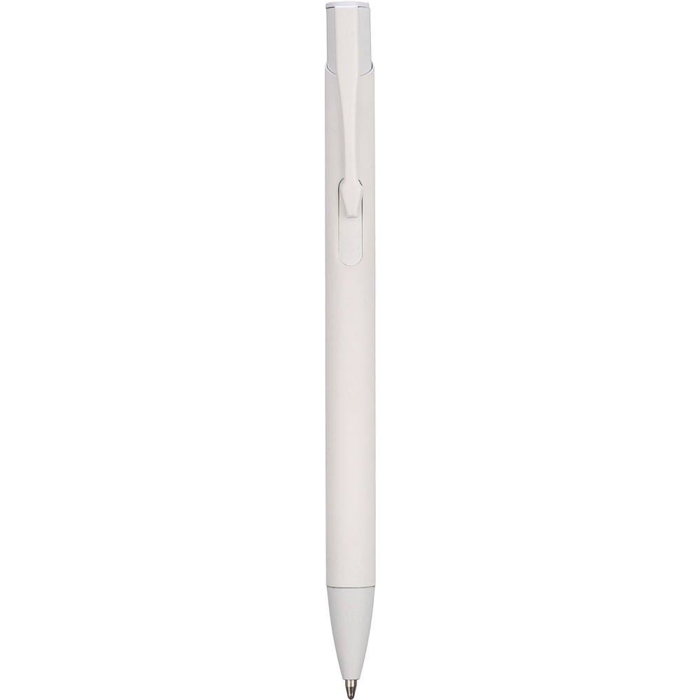 Újrahasznosított alumíniumból készült golyóstoll gumírozott bevonattal a tolltesten. A klipsz, a tollhegy és a nyomógomb azonos színű. A klipsz fémből, a tollhegy műanyagból készült. Kb. 800 méter íráshossz. Gravírozott újrahasznosított alumíniumra utaló logóval. Kék tollbetéttel. Emblémázás: Gravírozás, UV nyomtatás