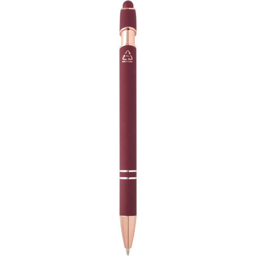 Nanna golyóstoll elegáns rózsaarany színben. A toll teste újrahasznosított alumíniumból, az érintőceruza pedig szilikonból készült, így érintőképernyős eszközökhöz is használható. Az újrahasznosított alumínium csökkenti a hulladéklerakók terhelését, segít megőrizni a természeti erőforrásokat, és célja az üvegházhatású gázok kibocsátásának mérséklése. Tinta színe: kék. Íráshossz: 800 méter. Tollhegy mérete: 1,0 mm. Emblémázás: Gravírozás, UV nyomtatás