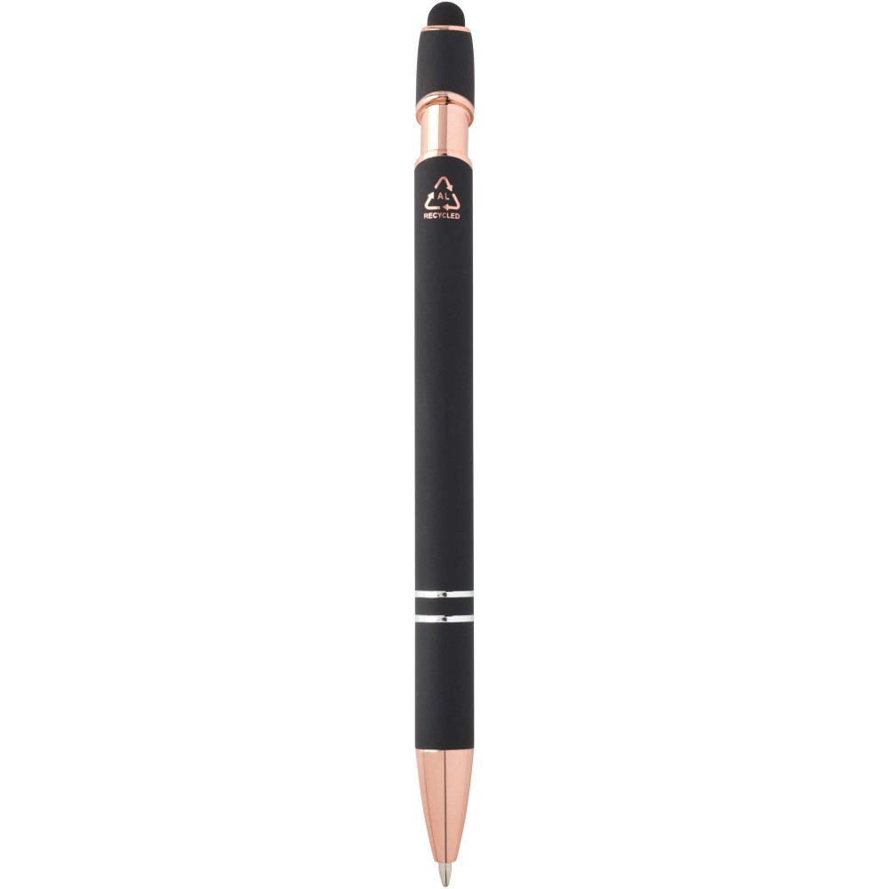 Nanna golyóstoll elegáns rózsaarany színben. A toll teste újrahasznosított alumíniumból, az érintőceruza pedig szilikonból készült, így érintőképernyős eszközökhöz is használható. Az újrahasznosított alumínium csökkenti a hulladéklerakók terhelését, segít megőrizni a természeti erőforrásokat, és célja az üvegházhatású gázok kibocsátásának mérséklése. Tinta színe: kék. Íráshossz: 800 méter. Tollhegy mérete: 1,0 mm. Emblémázás: Gravírozás, UV nyomtatás
