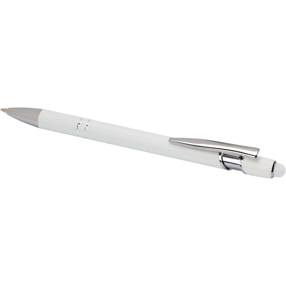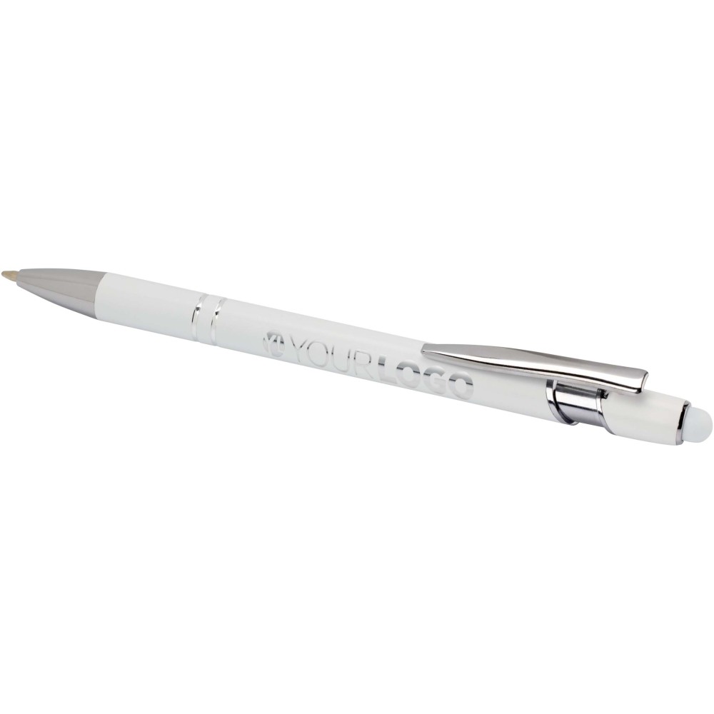 Kish golyóstoll ezüst színben. A toll teste újrahasznosított alumíniumból, az érintőceruza pedig szilikonból készült, így érintőképernyős eszközökhöz is használható. Az újrahasznosított alumínium csökkenti a hulladéklerakók terhelését, segít megőrizni a természeti erőforrásokat, és célja az üvegházhatású gázok kibocsátásának mérséklése. Tinta színe: kék. Íráshossz: 800 méter. Tollhegy mérete: 1,0 mm. Emblémázás: Gravírozás, Tamponnyomás