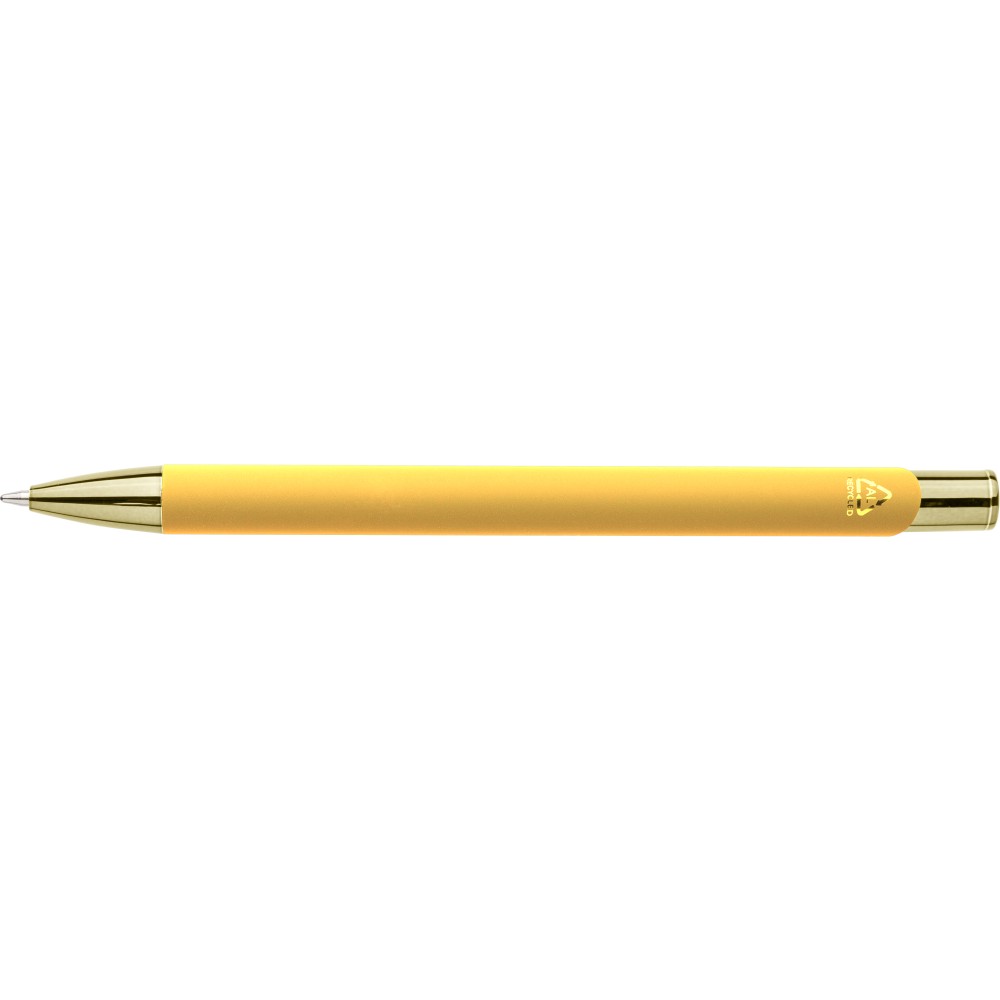 Újrahasznosított alumíniumból készült, gumírozott felületű golyóstoll, a toll színével harmonizáló UV-bevonatú műanyag és fém díszítéssel. Gravírozás után fényes tükörhatás jelenik meg. A tolltesten gravírozott recycled (újrahasznosított) alapanyagra utaló logó található. Megközelítőleg 800 méter íráshosszúságú, kék színű tollbetéttel. Emblémázás: UV nyomtatás,