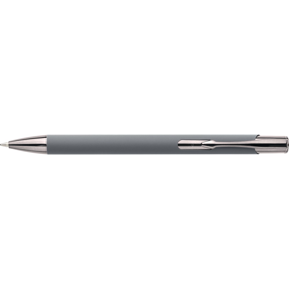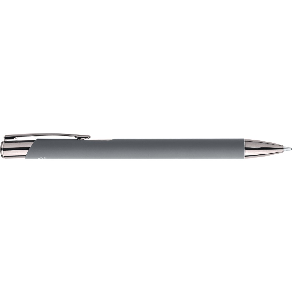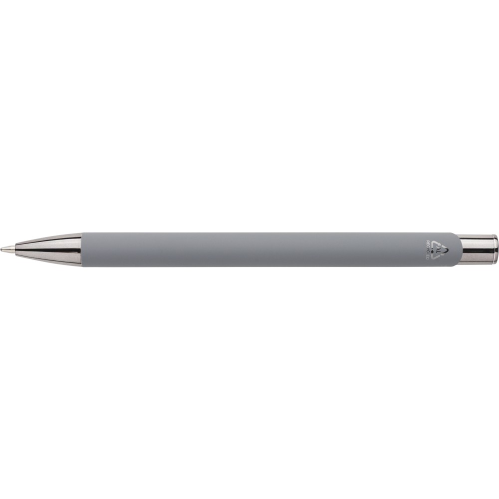 Újrahasznosított alumíniumból készült, gumírozott felületű golyóstoll, a toll színével harmonizáló UV-bevonatú műanyag és fém díszítéssel. Gravírozás után fényes tükörhatás jelenik meg. A tolltesten gravírozott recycled (újrahasznosított) alapanyagra utaló logó található. Megközelítőleg 800 méter íráshosszúságú, kék színű tollbetéttel. Emblémázás: UV nyomtatás,