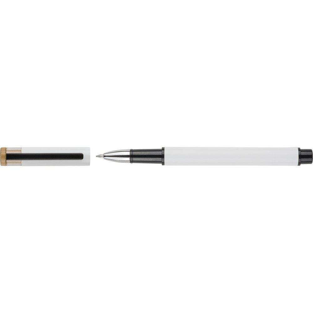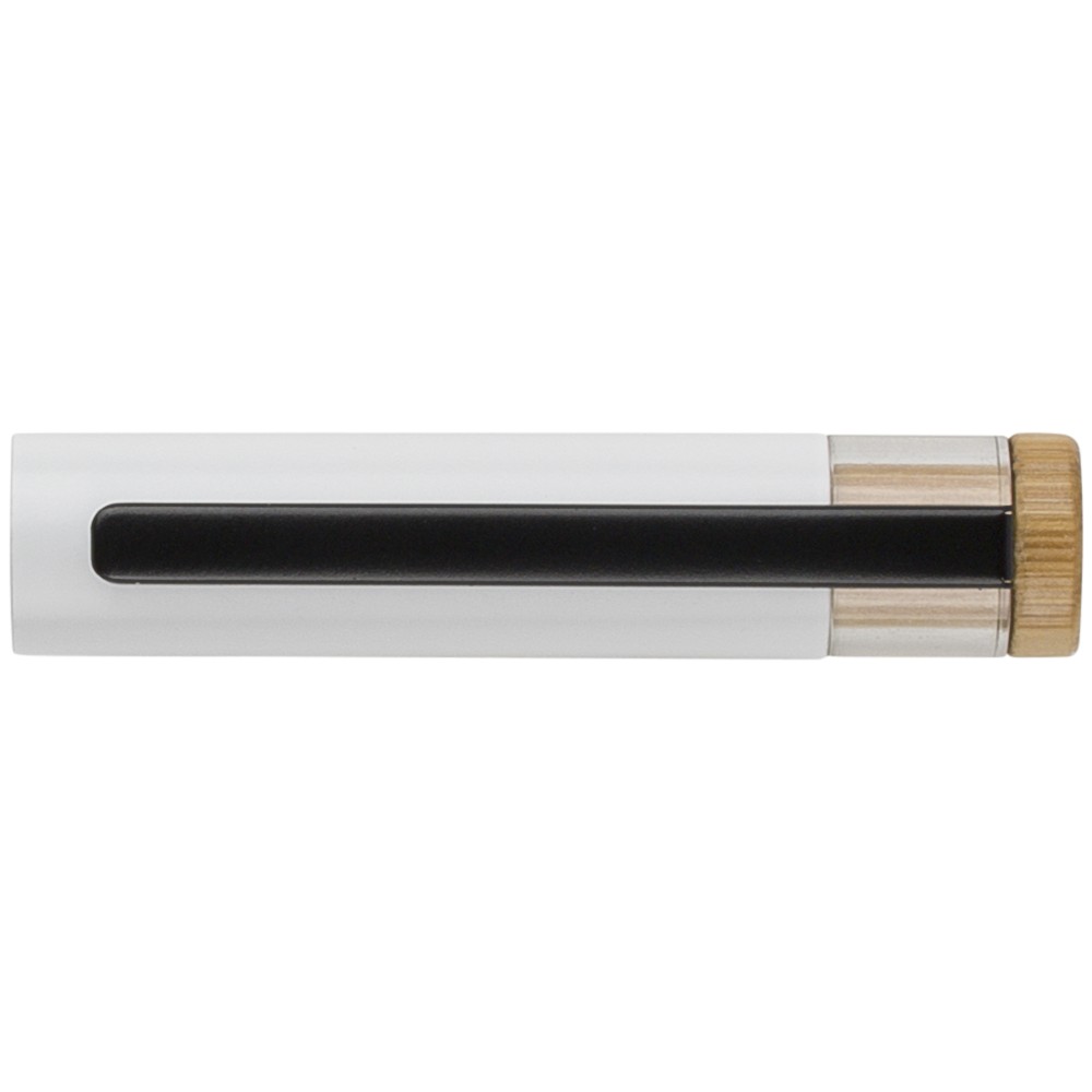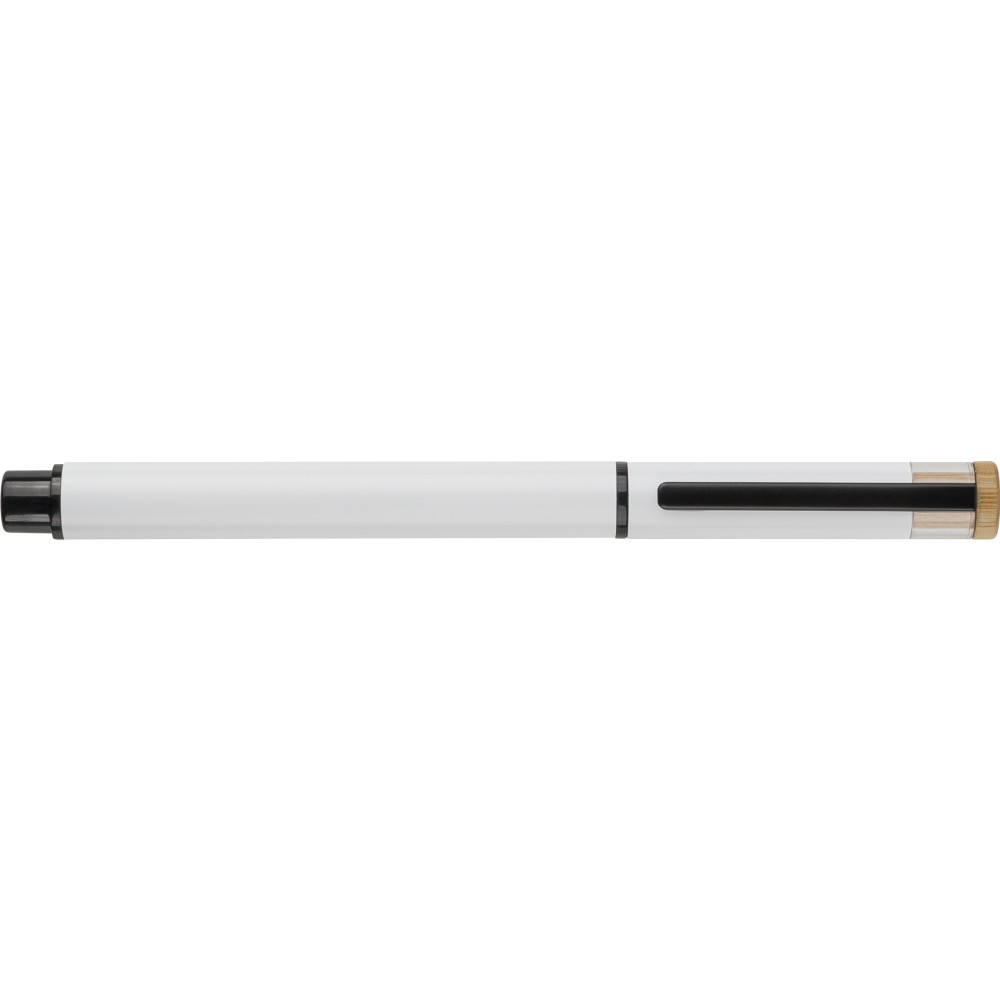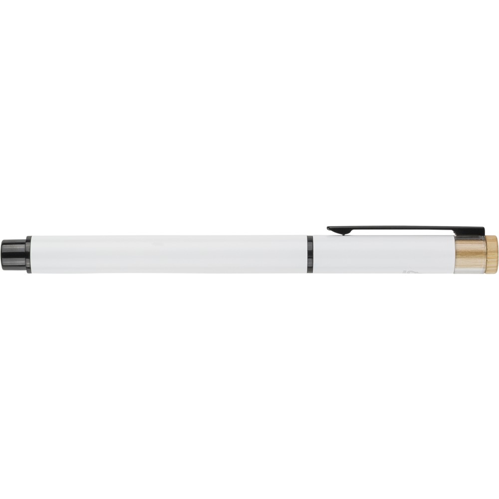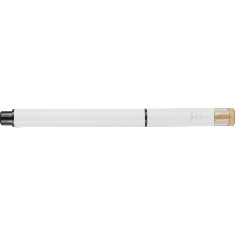 Újrahasznosított alumíniumból készült, lakkozott tollszett golyóstollal és rollerball tollal. A golyóstoll bambusz nyomógombbal, rPET díszítéssel és fém klippel rendelkezik, míg a rollerball toll bambusz/rPET kupakdíszítéssel és hozzá illeszkedő klippel. A tolltesten gravírozott recycled (újrahasznosított) alapanyagra utaló logó található mindkét toll esetében. A golyóstoll kb. 700 méter, a roller toll kb. 500 méter íráskapacitású, mindkettő kék színű tollbetéttel. Színes, újrahasznosított kartonból készült ajándékdobozba csomagolva. Emblémázás: Tamponnyomás, UV nyomtatás