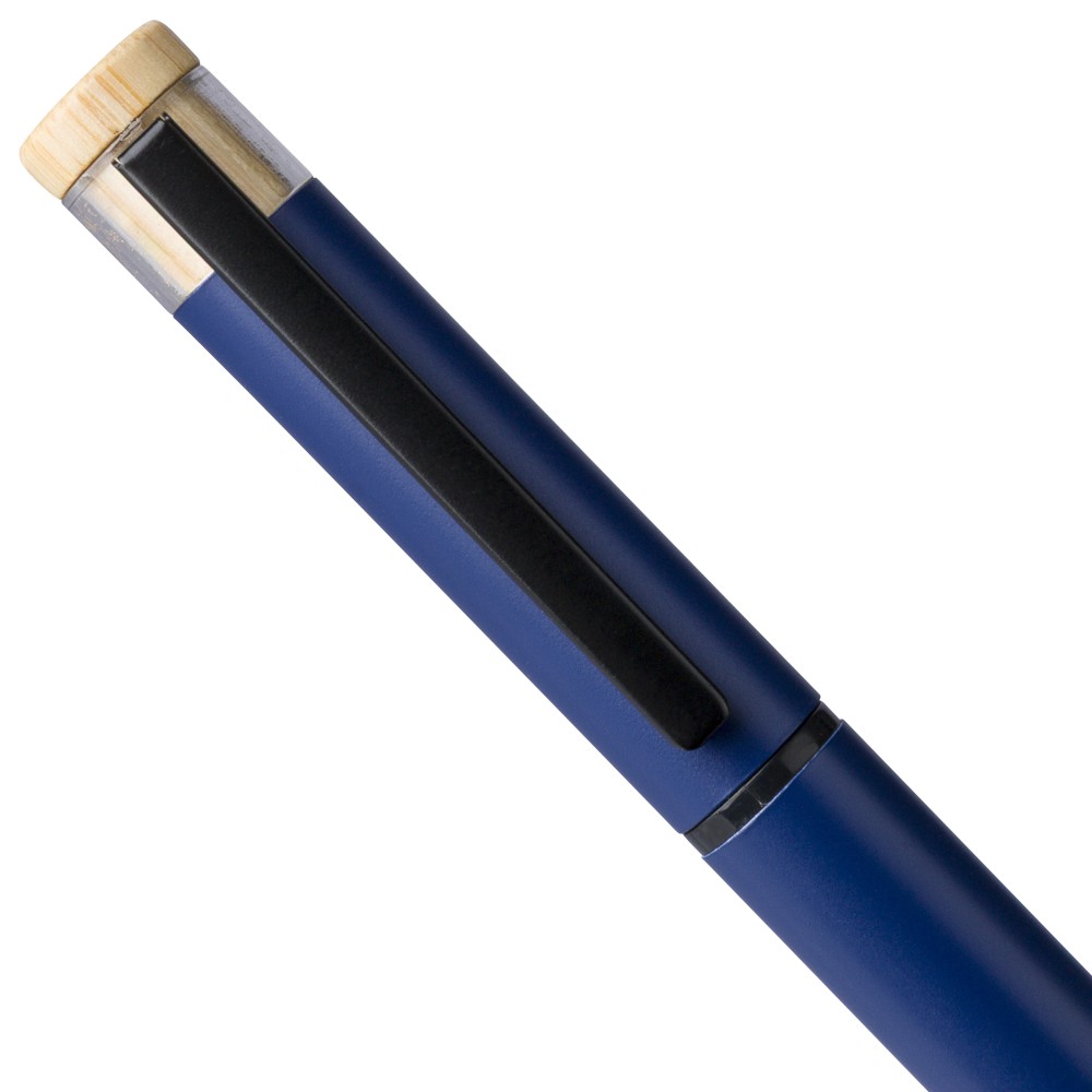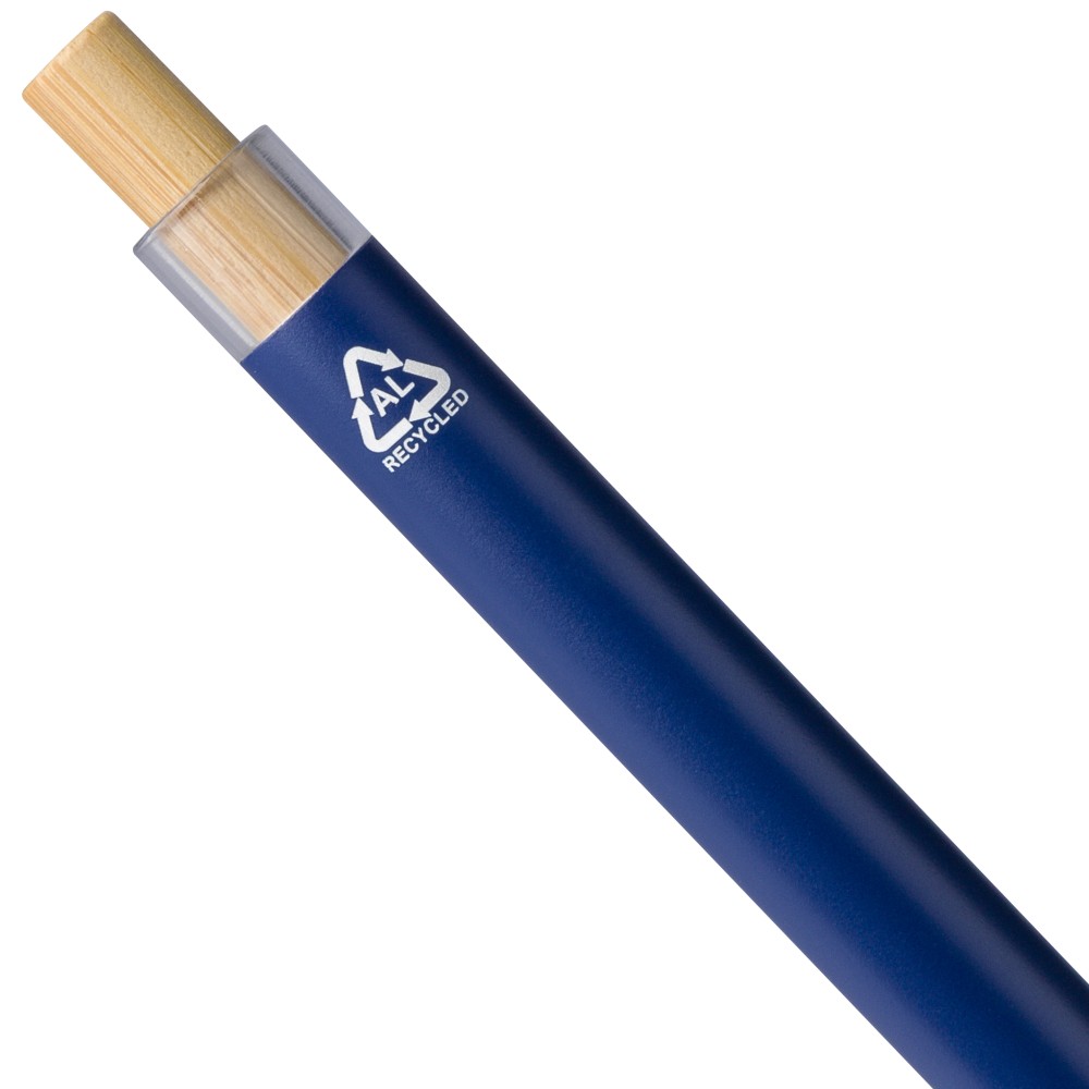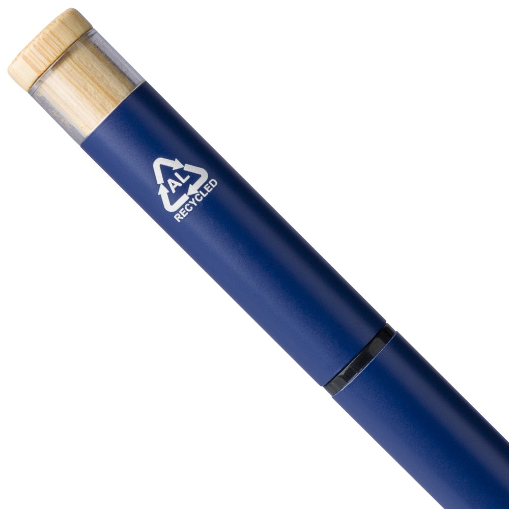 Újrahasznosított alumíniumból készült, lakkozott tollszett golyóstollal és rollerball tollal. A golyóstoll bambusz nyomógombbal, rPET díszítéssel és fém klippel rendelkezik, míg a rollerball toll bambusz/rPET kupakdíszítéssel és hozzá illeszkedő klippel. A tolltesten gravírozott recycled (újrahasznosított) alapanyagra utaló logó található mindkét toll esetében. A golyóstoll kb. 700 méter, a roller toll kb. 500 méter íráskapacitású, mindkettő kék színű tollbetéttel. Színes, újrahasznosított kartonból készült ajándékdobozba csomagolva. Emblémázás: Tamponnyomás, UV nyomtatás