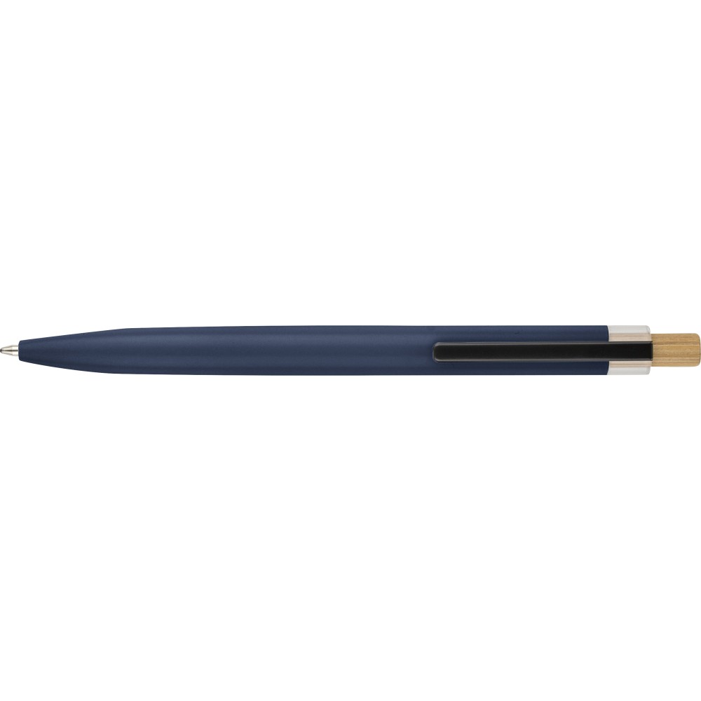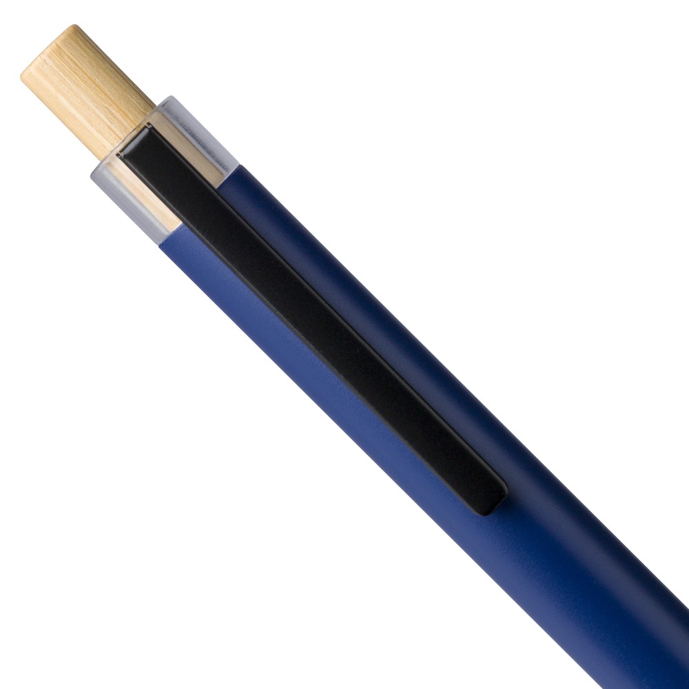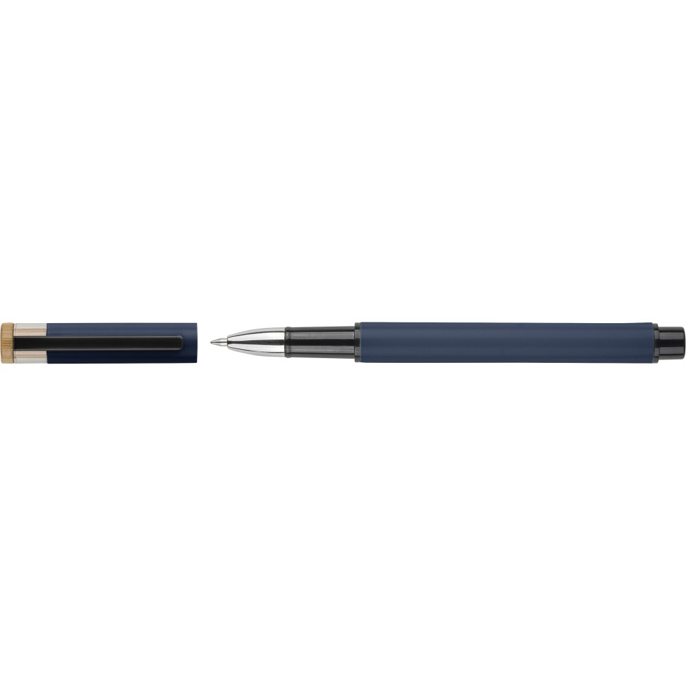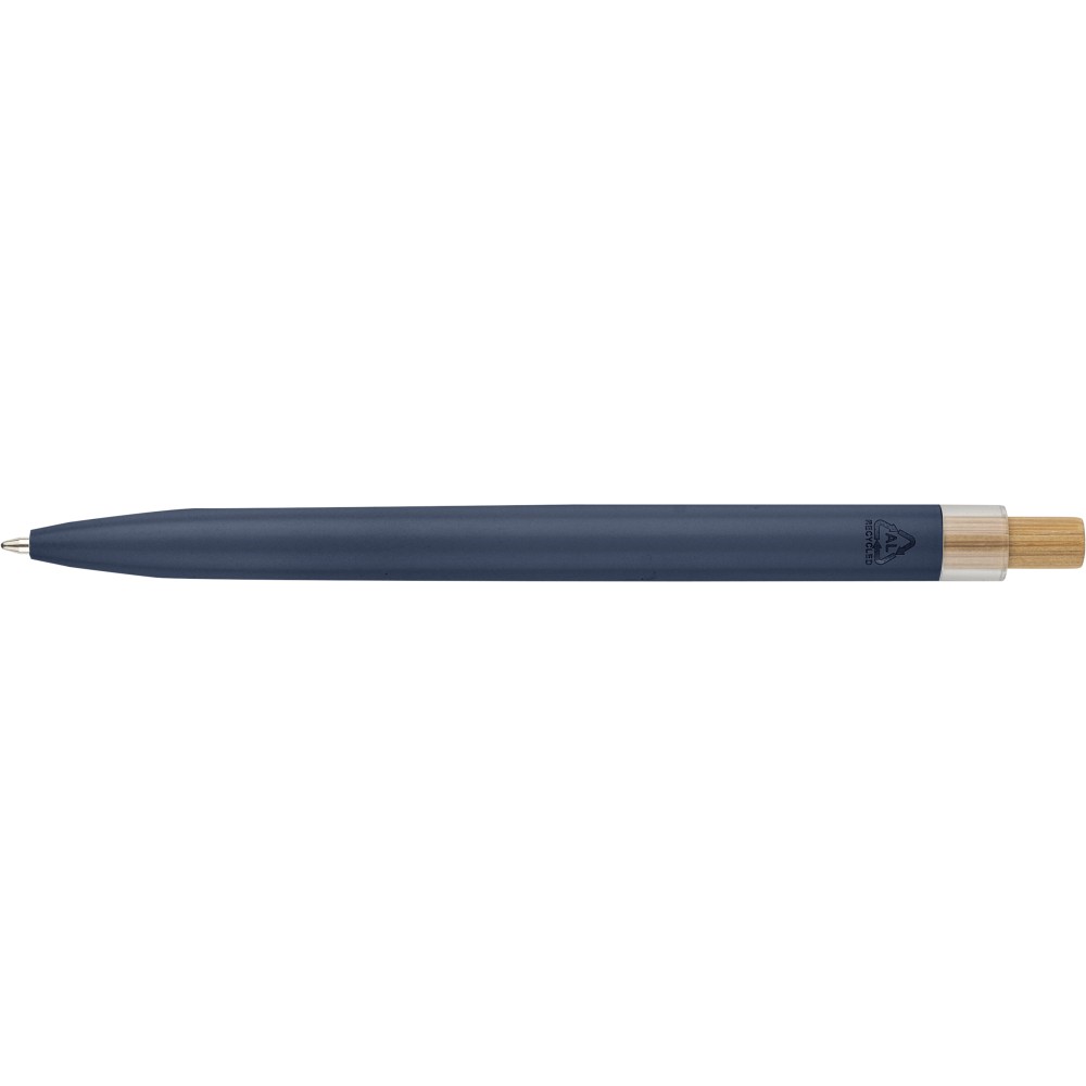 Újrahasznosított alumíniumból készült, lakkozott tollszett golyóstollal és rollerball tollal. A golyóstoll bambusz nyomógombbal, rPET díszítéssel és fém klippel rendelkezik, míg a rollerball toll bambusz/rPET kupakdíszítéssel és hozzá illeszkedő klippel. A tolltesten gravírozott recycled (újrahasznosított) alapanyagra utaló logó található mindkét toll esetében. A golyóstoll kb. 700 méter, a roller toll kb. 500 méter íráskapacitású, mindkettő kék színű tollbetéttel. Színes, újrahasznosított kartonból készült ajándékdobozba csomagolva. Emblémázás: Tamponnyomás, UV nyomtatás