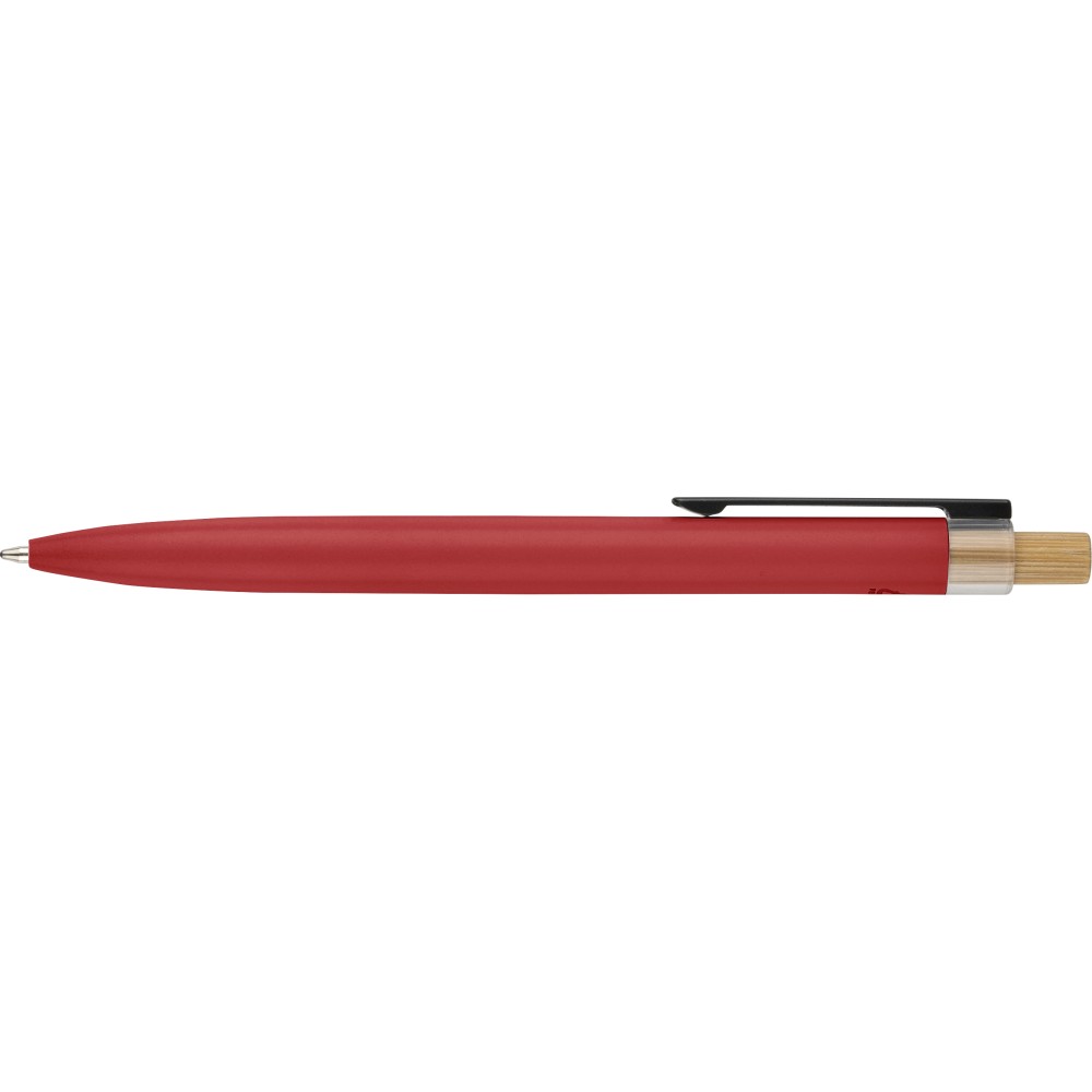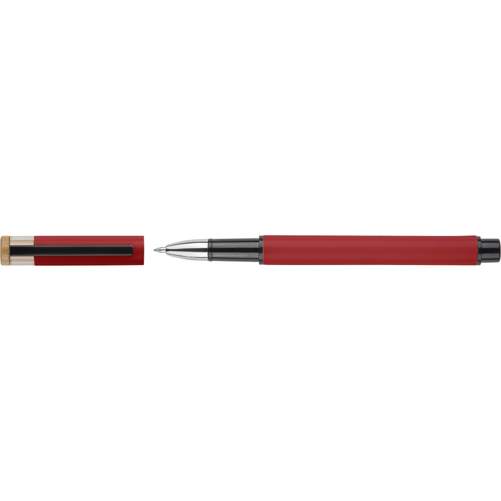Újrahasznosított alumíniumból készült, lakkozott tollszett golyóstollal és rollerball tollal. A golyóstoll bambusz nyomógombbal, rPET díszítéssel és fém klippel rendelkezik, míg a rollerball toll bambusz/rPET kupakdíszítéssel és hozzá illeszkedő klippel. A tolltesten gravírozott recycled (újrahasznosított) alapanyagra utaló logó található mindkét toll esetében. A golyóstoll kb. 700 méter, a roller toll kb. 500 méter íráskapacitású, mindkettő kék színű tollbetéttel. Színes, újrahasznosított kartonból készült ajándékdobozba csomagolva. Emblémázás: Tamponnyomás, UV nyomtatás