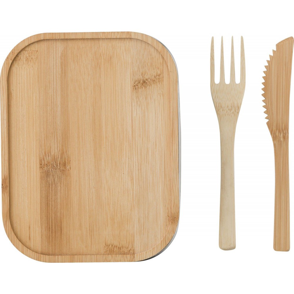 Rozsdamentes acél ételdoboz bambusz fedővel, késsel, villával, összefogó pánttal. 600 ml. Emblémázás: Gravírozás, Tamponnyomás