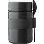 Rozsdamentes acélból készült duplafalú edény, fekete PP kanállal és az edény színével megegyező színű szilikon fogóval. Belül rozsdamentes acél 304, kívül rozsdamentes acél 201. PP fedéllel. Űrtartalom: 460 ml. Emblémázás: Gravírozás, Tamponnyomás