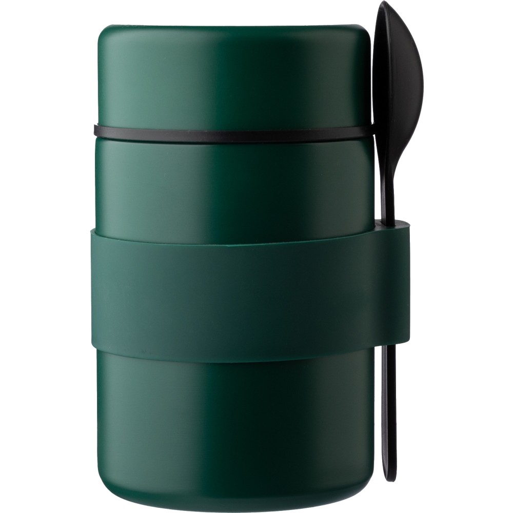 Rozsdamentes acélból készült duplafalú edény, fekete PP kanállal és az edény színével megegyező színű szilikon fogóval. Belül rozsdamentes acél 304, kívül rozsdamentes acél 201. PP fedéllel. Űrtartalom: 460 ml. Emblémázás: Gravírozás, Tamponnyomás