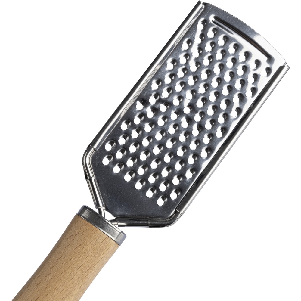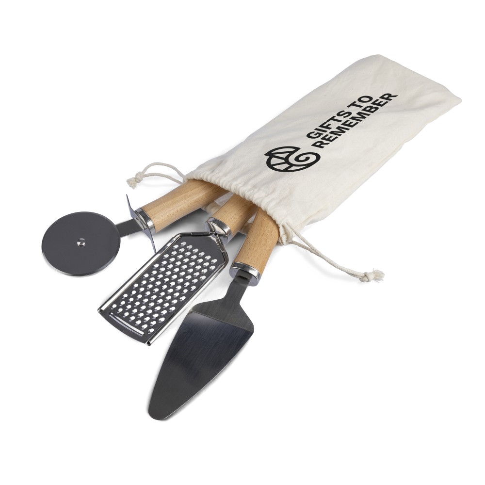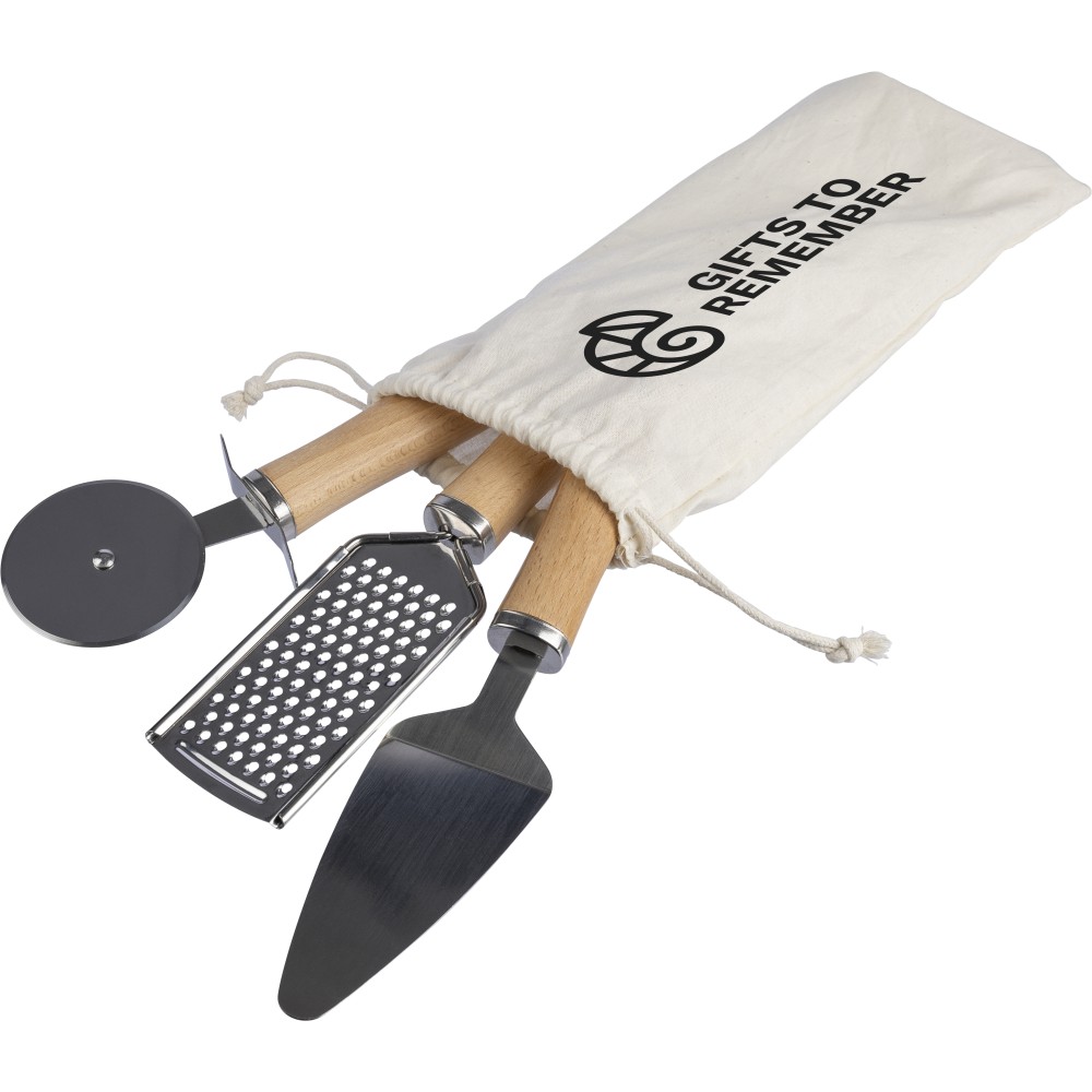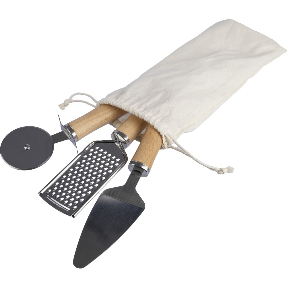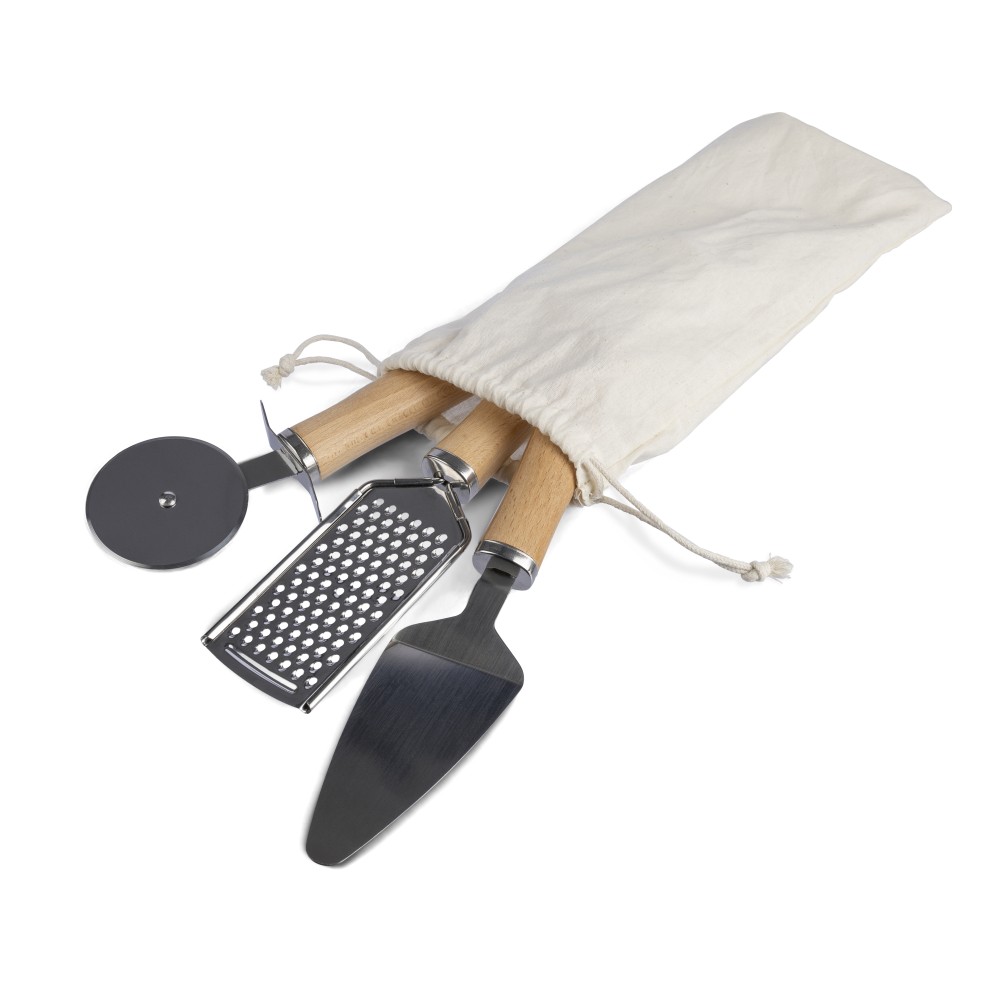 Fém és fa konyhai eszközkészlet vászontasakban. A készlet egy rozsdamentes acél reszelőt, tortalapátot és pizzavágót tartalmaz. Valamennyi eszköz fa nyéllel készült. Mosogatógépben nem tisztítható. Emblémázás: Gravírozás