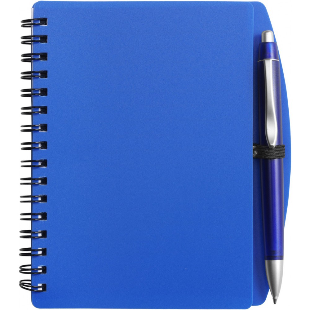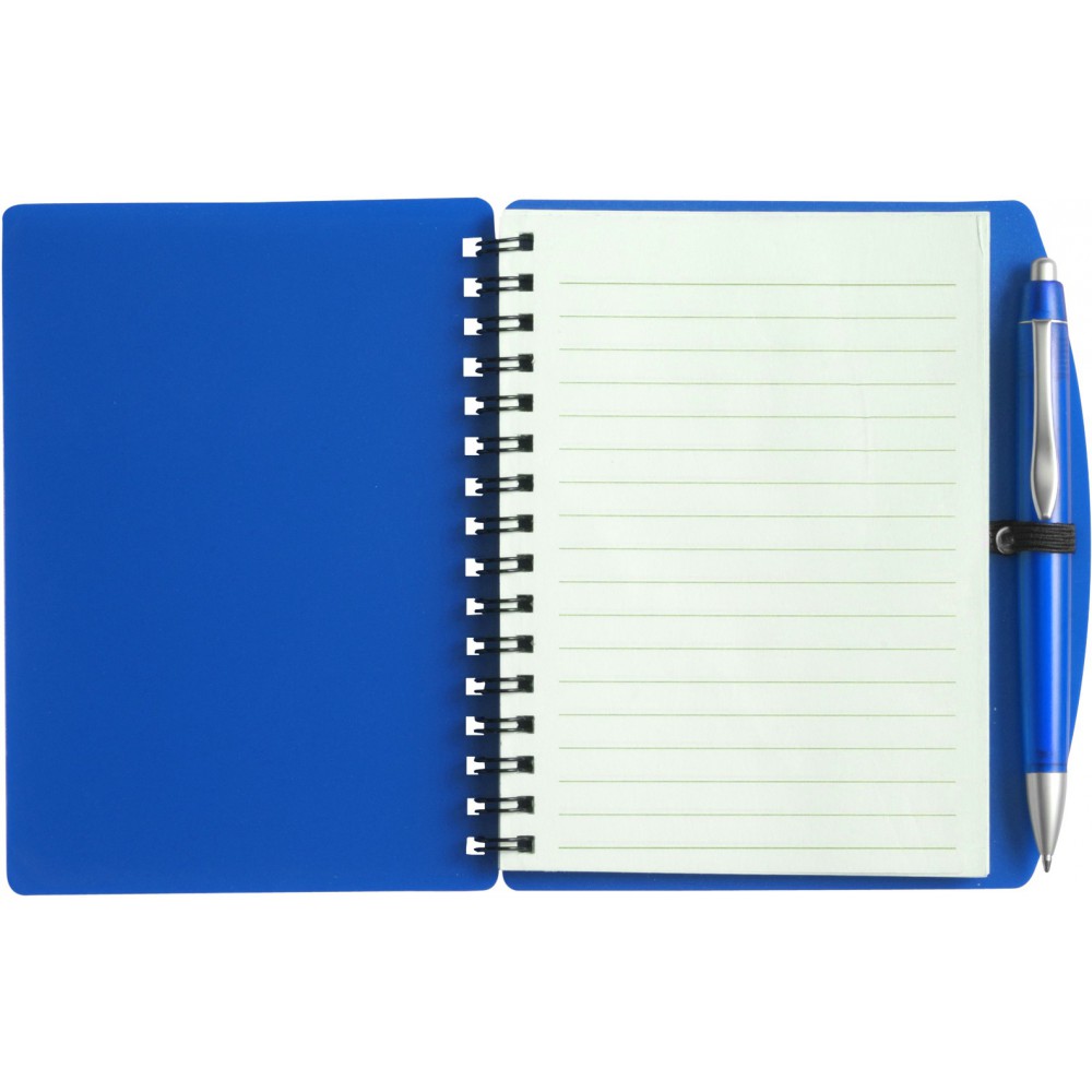 A6-os spirálfüzet PP borítóval, 65 lapos tömbbel, műanyag tollal, kék tollbetéttel. Emblémázás: Tamponnyomás