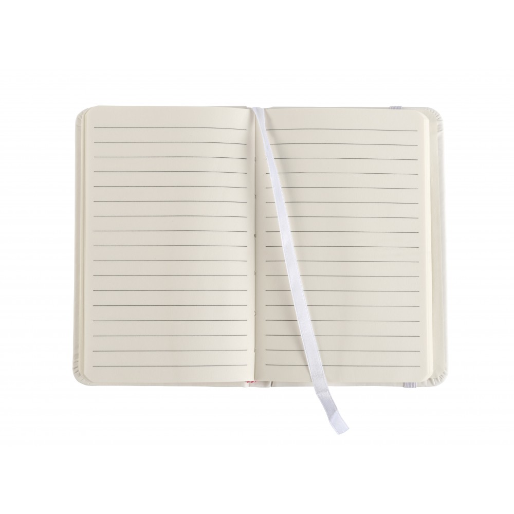 Puha PU borítású A6-os jegyzetfüzet 96 vonalas lappal, jelölőszalaggal és gumipánttal. Emblémázás: Szitanyomás, Tamponnyomás, UV nyomtatás