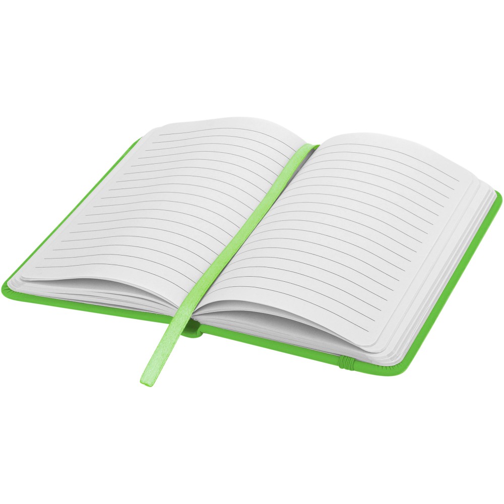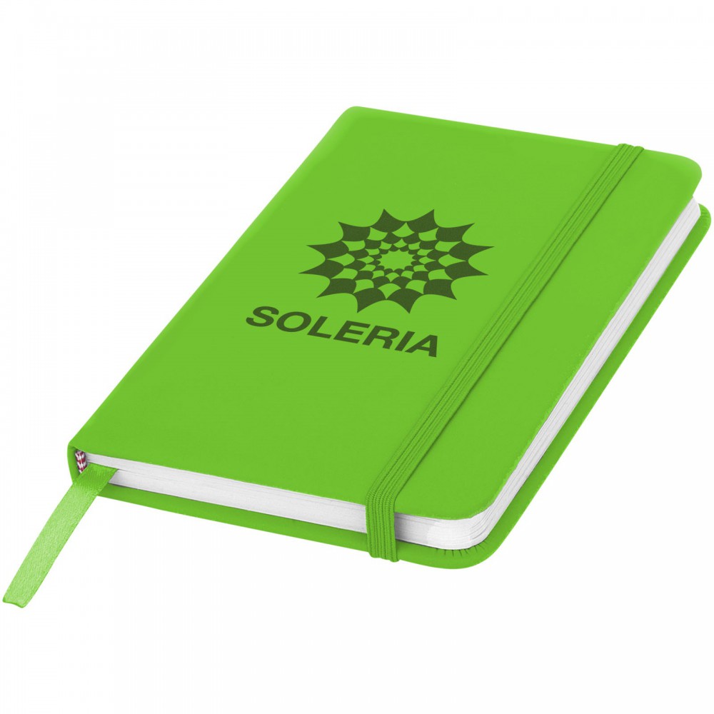 Spectrum A6 jegyzetfüzet színes fedéllel, jelölőszalaggal és gumipánttal, 96 vonalas lappal (60g/m2). PVC fedett karton. Emblémázás: Szitanyomás, Tamponnyomás, UV nyomtatás