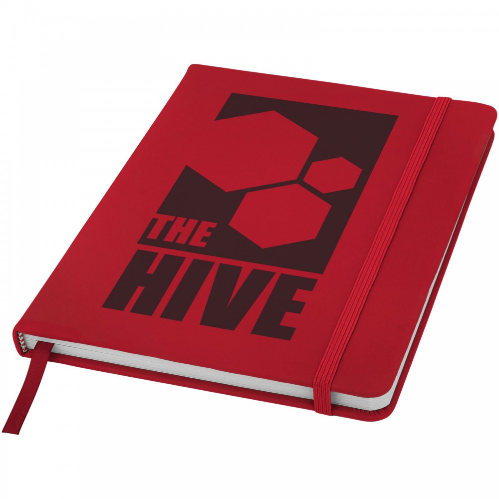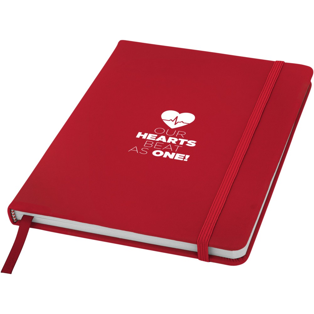 Spectrum A/5 jegyzetfüzet színes fedéllel, jelölőszalaggal és gumipánttal, 96 vonalas lappal (60g/m2). Emblémázás: Szitanyomás, Tamponnyomás, UV nyomtatás
