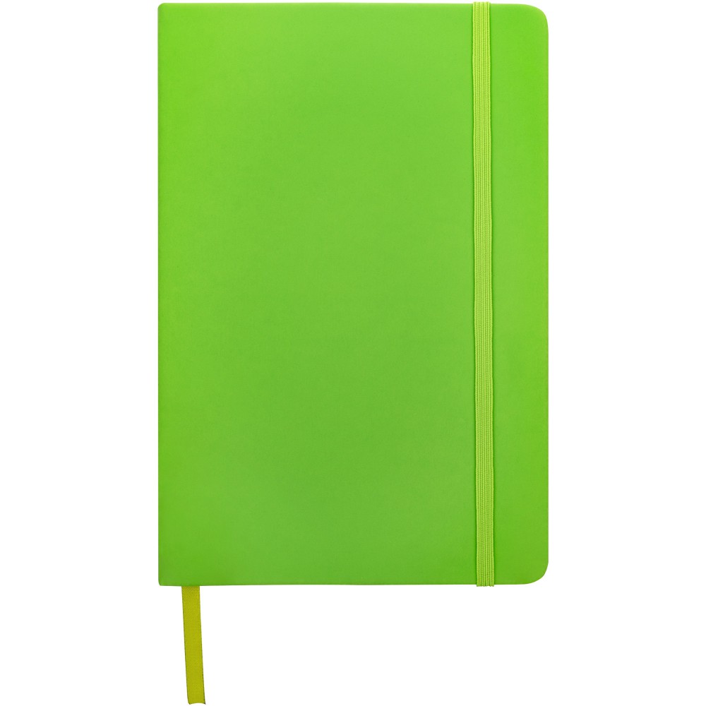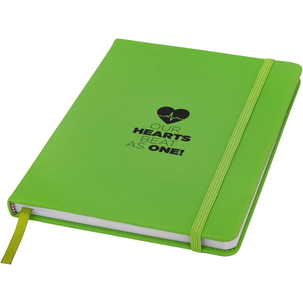 Spectrum A/5 jegyzetfüzet színes fedéllel, jelölőszalaggal és gumipánttal, 96 vonalas lappal (60g/m2). Emblémázás: Szitanyomás, Tamponnyomás, UV nyomtatás